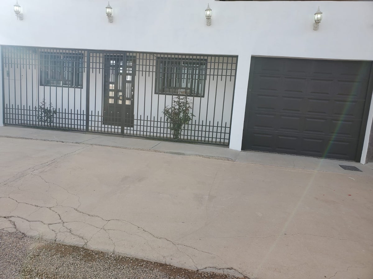 Cómoda y cálida casa completa para viajeros solos o en familia con cochera cerrada para 2 vehículos, cuenta con 2 recamaras una de ellas con cama matrimonial y pantalla inteligente de 70”y la otra con 2 camas individuales. tenemos una comoda sala con pantalla Gigante de 70" smartv donde podrán descansar y pasar un excelente momento con familia y amigos. cuenta con una cocina completa equipada. siéntete seguro, contamos con cámaras de seguridad al exterior de la casa.