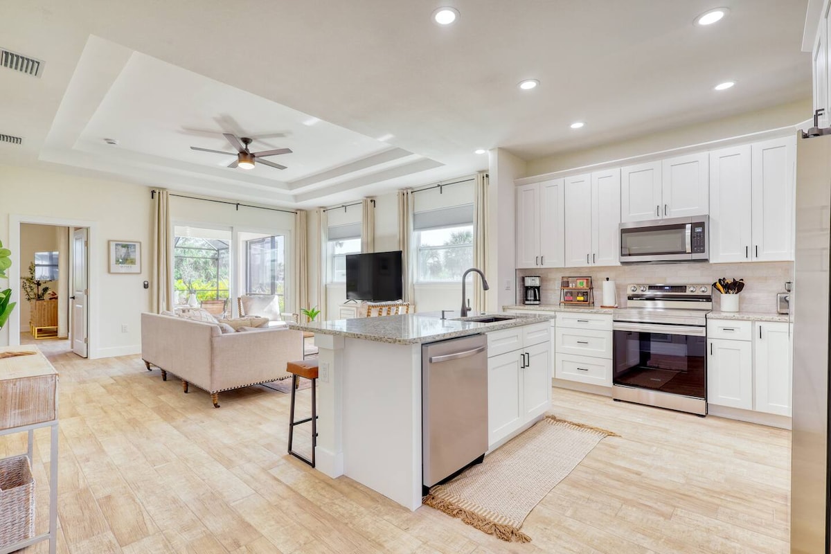 Your Perfect Florida Getaway Awaits! Bring the whole family to this stylish and spacious 4-bedroom villa with a heated pool. Located in a quiet neighborhood, just a short drive from beautiful beaches, lively bars, and top restaurants. Relax with a BBQ on the patio overlooking the golf course, take a swim, or cycle the scenic Cape Haze Trail. Sunshine, space, and unforgettable memories—book your stay today! Please note that the pool is heated at no extra cost.