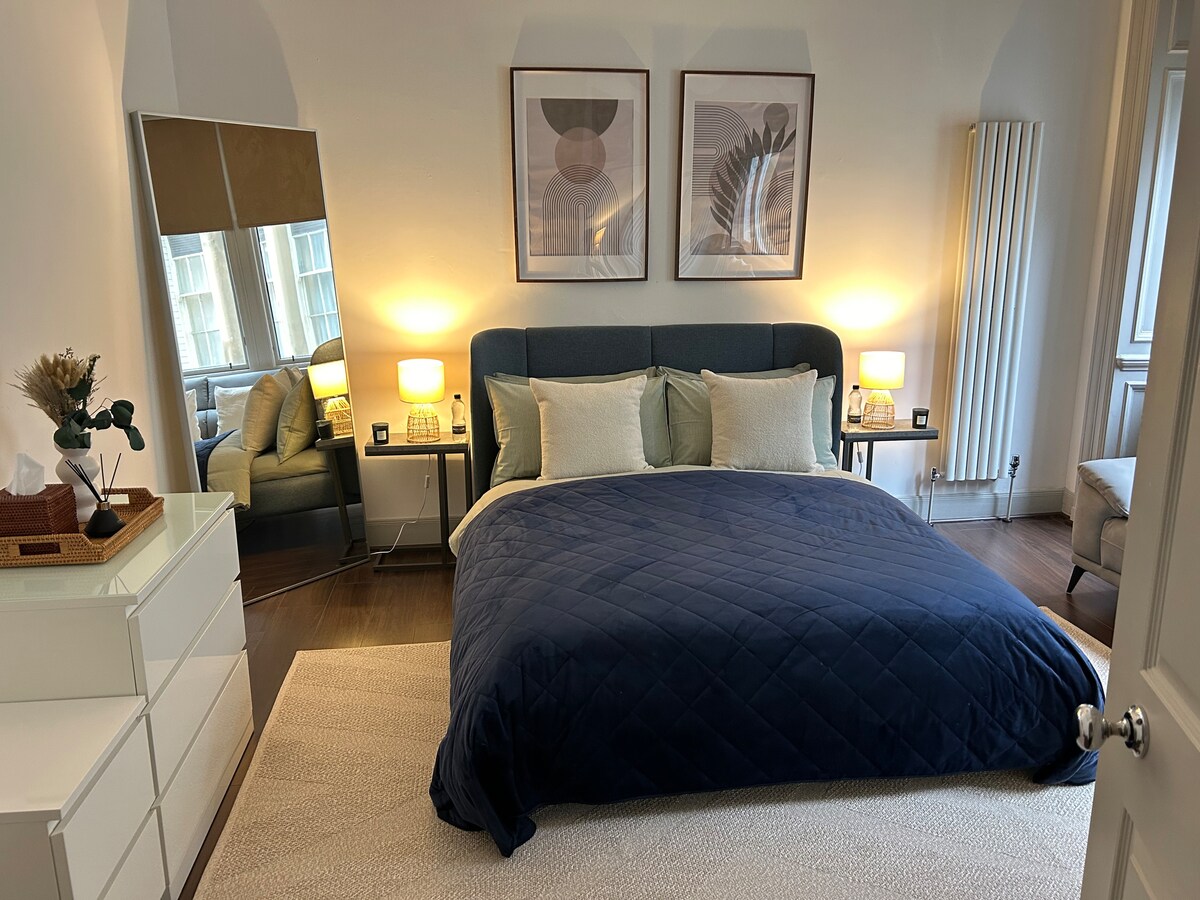 Está lleno de luz y es espacioso para ser un apartamento de un dormitorio. Está lleno de cosas divertidas que he coleccionado a lo largo de los años, ¡así que viene con bolsas de mi personalidad! Es tranquilo, especialmente el dormitorio que se encuentra en la parte trasera. Me gusta cocinar, por lo que la cocina está bien equipada. Trae tu música: ¡hay un buen altavoz bluetooth de Sony para conectarte! Accede a todas las áreas, aunque mantengo la bodega y un archivador en el dormitorio cerrados con llave para mis propias cosas. A tu llegada, prefiero conocer a los huéspedes en persona para que te instales y compartir mis recomendaciones locales que se ajusten a tus planes y horarios. New Town es Patrimonio de la Humanidad por la UNESCO y está cuidadosamente protegida de nuevos desarrollos. Es compatible con una encantadora mezcla de propiedades residenciales y tiendas minoristas, incluyendo toneladas de cafeterías, galerías privadas, restaurantes y tiendas de diseño de interiores. Parada de autobús a la vuelta de la esquina y parada de tranvía a 5 minutos en St Andrews Square. A 10 minutos a pie de la estación principal de tren, el castillo de Edimburgo y el corazón de Edimburgo. Parada de taxis a 5 minutos a pie por Dundas Street y taxis generalmente disponibles en la calle también. Ten en cuenta que mi televisor funciona a través de Internet, por lo que solo puedes ver contenido de BBC iPlayer/Netflix/Amazon. La cama es doble estándar, es decir, 4 pies 6 pulgadas de ancho y 6 pies 3 pulgadas de largo (137 x 190 cm). La cama estará preparada para tu llegada, incluyendo 4 almohadas de plumas, un edredón y una manta caliente. En la cómoda encontrarás una almohada para alérgicos y una botella de agua caliente. Proporciono dos toallas grandes, una toalla de mano, una toalla de cocina y una alfombrilla de baño para cada reserva.