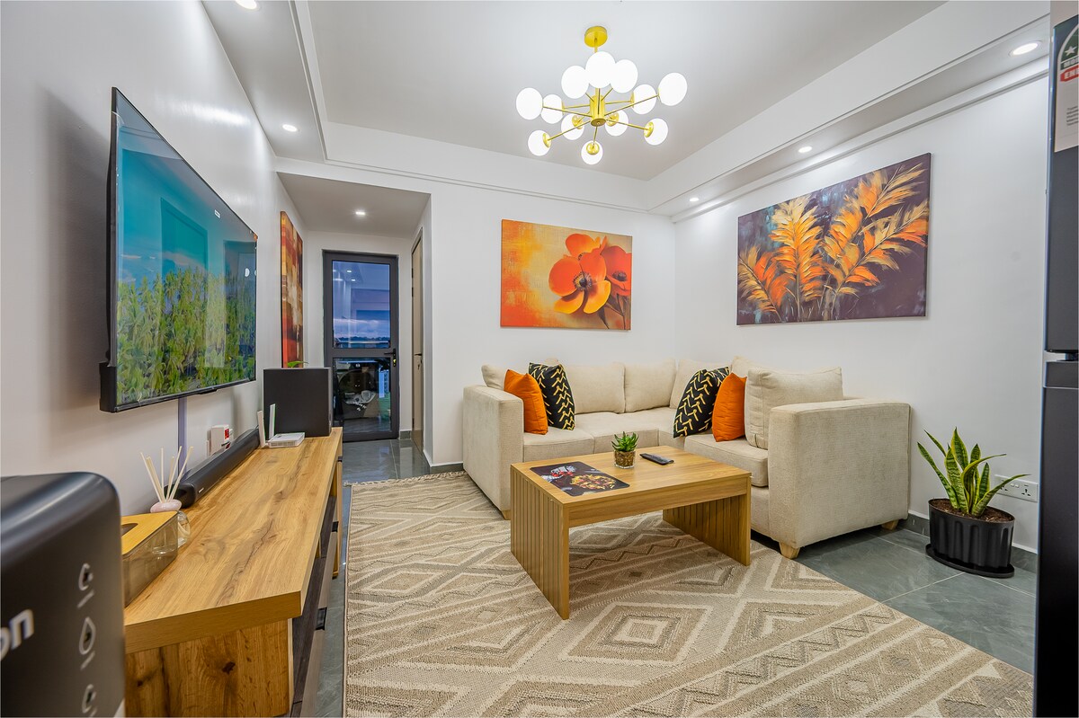 This modern, minimalist 3-bedroom, 2-bath apartment/flat offers a perfect blend of comfort and convenience for travellers—whether professionals, families, groups, or tourists. Enjoy access to a gym, unheated swimming pool and a children's playroom. Conveniently located across from a 24/7 Naivas supermarket and just a short walk to Junction Mall, this space is ideal for both short and long stays, providing a cozy, home-like atmosphere while away.