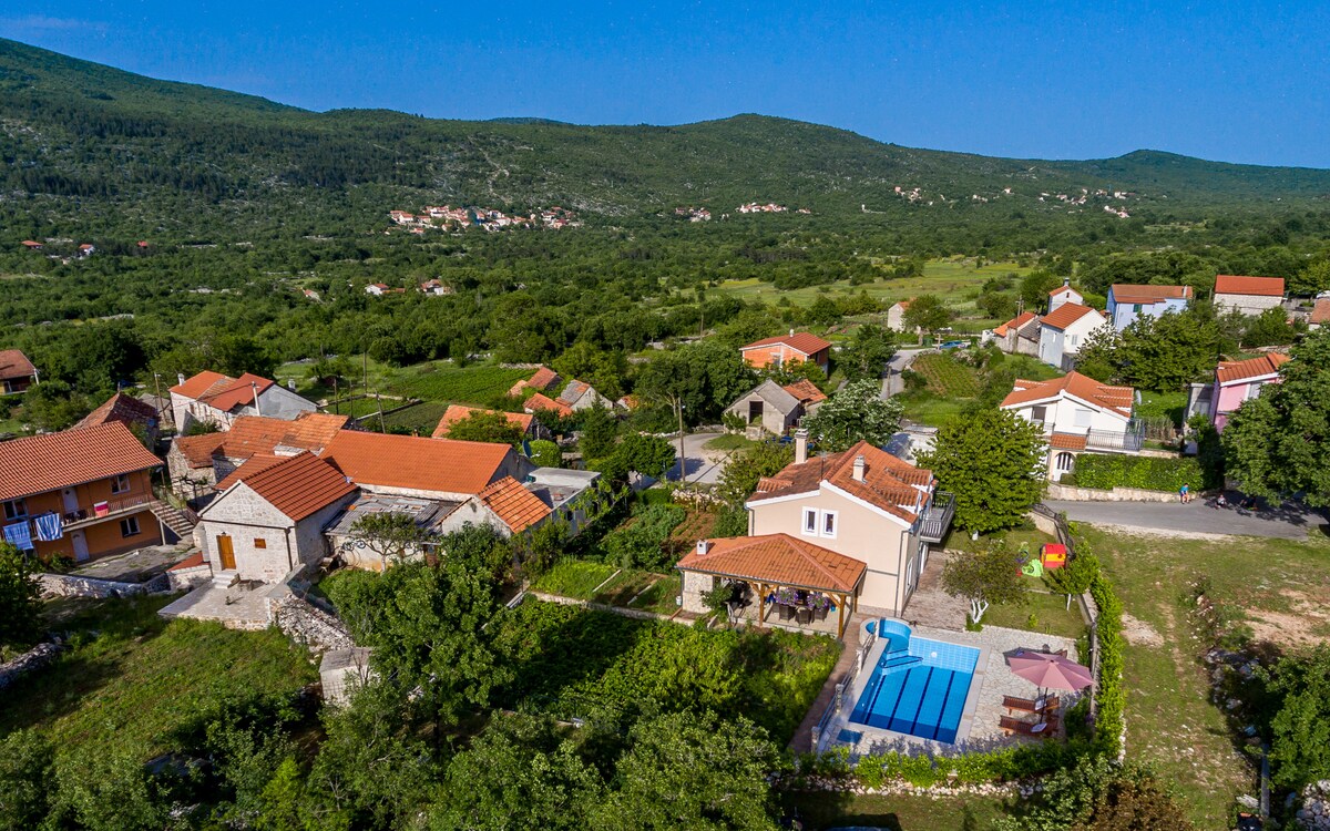 Beautiful three bedroom house Memories and joy is located in Slivno near Imotski, only 30 kilometers away from Makarska. Small village in the Dalmatian hills and is ideal for a pleasant family vacation. Villa can accommodate up to 6 persons. At your disposal are 3 bedrooms, 2 bathrooms, living room and fully equipped kitchen with dining area. Beautiful, spacious garden, large pool, outdoor dining area with grill makes this house ideal for a completely stress-free and perfectly relaxing holiday.