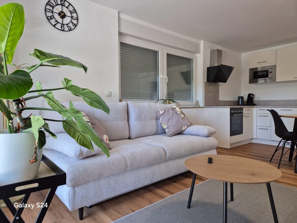 Welcome to Apartments Münchbach in Rust! This appartment (75m²) awaits you in a modern design and offers you everything you need for a nice short or long stay. -> close to Europa-Park + Rulantica -> separate bedroom -> king-size box-spring bed -> air conditioning -> Smart-TV + WiFi -> fully equipped kitchen -> living/dining area -> bed linen + towels -> terrace -> parking space ☆"We are more than thrilled and would always choose to stay with Ingrid again."