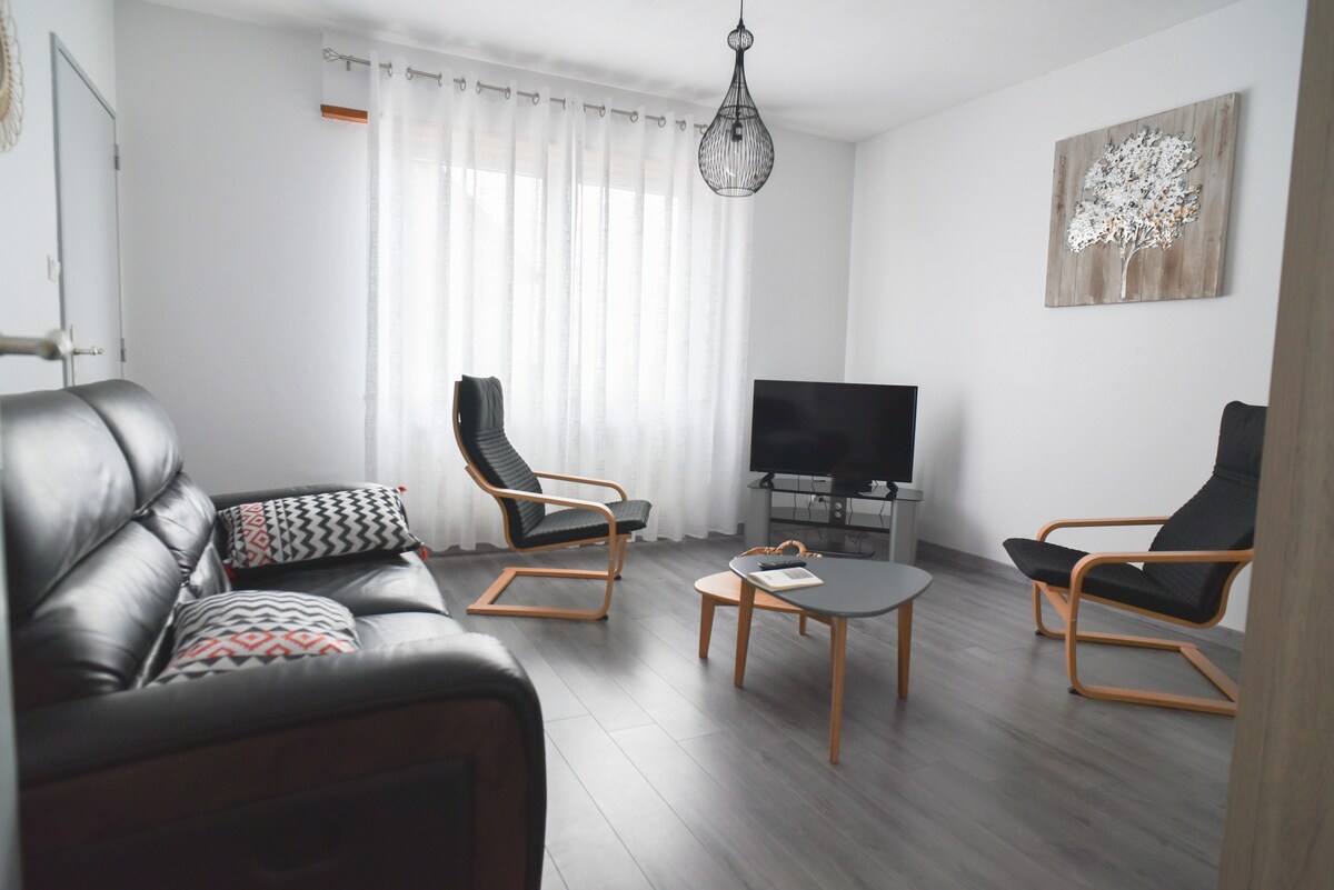 Alojamiento de 3 llaves (CléVacances), situado en el distrito de los jardines del mercado, residencia tranquila, a 12 minutos a pie del casco antiguo. Cerca de la estación de tren, autopista y tiendas (supermercado, farmacia, panadería). Estacionamiento privado. Cocina equipada (placa de inducción, lavavajillas, horno, microondas, nevera, tostadora, hervidor de agua, cafetera). Sala con mesa, TV de gran formato, internet. Balcón con muebles. Lavadora de ducha italiana de baño, secadora, secador de pelo. LLEGADAS HASTA LAS 7:30 P. M.