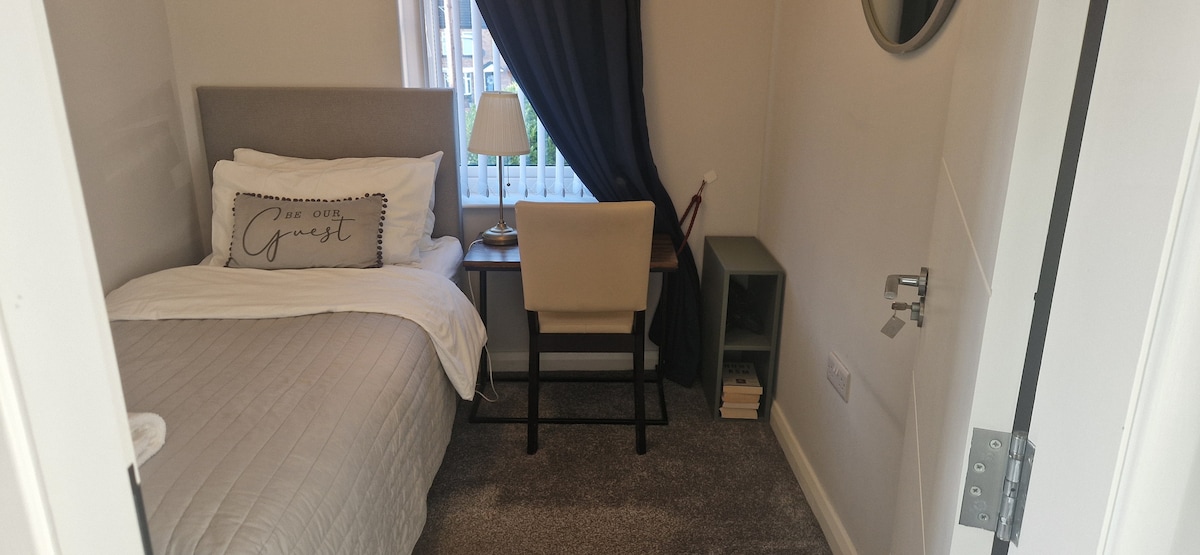 Un acogedor dormitorio de invitados con una cama doble muy cómoda, ropa de cama acogedora en una casa tranquila y céntrica. Está situado a poca distancia del aeropuerto de la ciudad de Belfast, del hotel y museo Titanic y del transporte público (metro y autobús), a 5 minutos a pie de la puerta principal. Este espacio es compacto y el equipaje de gran tamaño no cabe. Arthur (nacido en abril de 2023), un perro salchicha en miniatura, también vive en la propiedad conmigo. Es superamable y muy adorable.