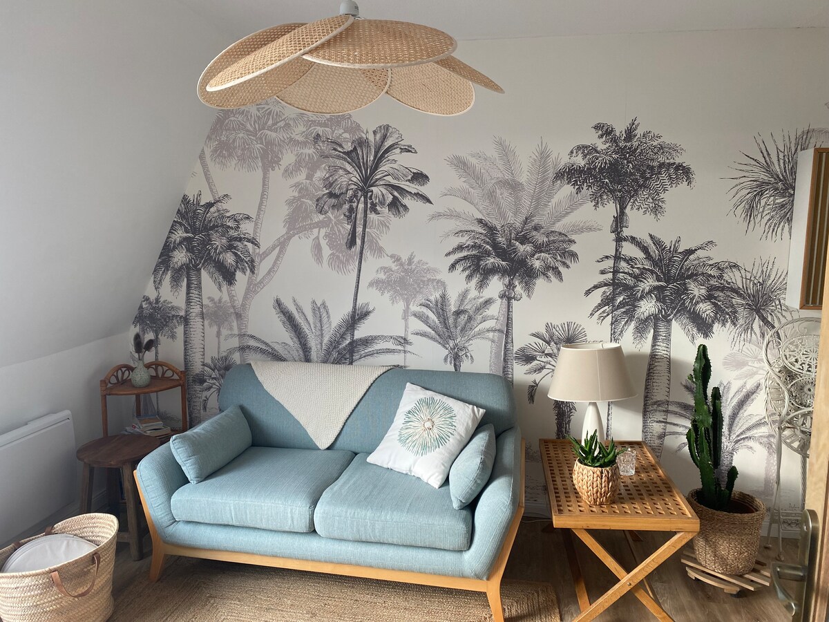 Relájese en este alojamiento de 27 m2 muy tranquilo, elegante y soleado y disfrute del ambiente del campo a solo 2 minutos a pie de la playa. ¡Le mecerá el canto de los pájaros! Apartamento muy cómodo y encantador en el 1.er piso, muy bien situado a 2 minutos de la playa y muy cerca de un supermercado, una panadería y muchos restaurantes en la playa. Servicio: Se proporcionan sábanas y ropa de hogar. Plaza de aparcamiento gratuita y nominativa en el edificio.
