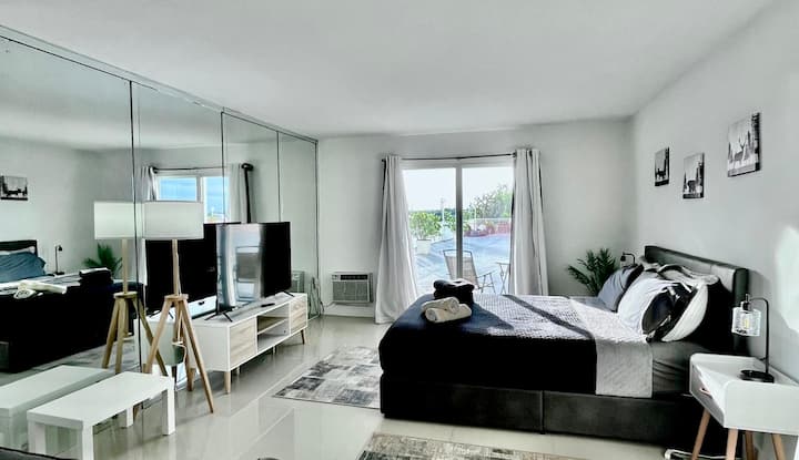 Estudio elegante | Cocina pequeña, piscina, 2 camas tamaño queen
