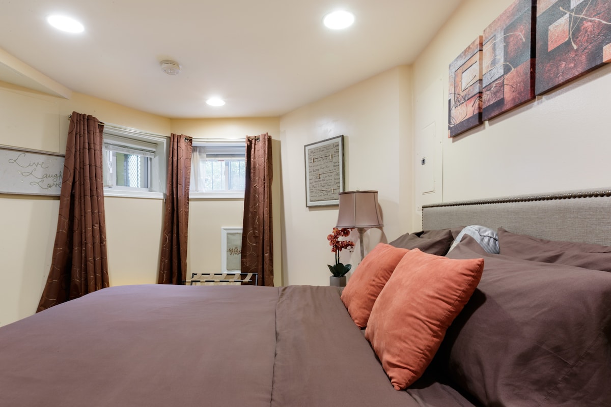 Apartamento privado en el sótano inglés con ventanas de tamaño completo y techos de 8 pies • Entrada privada delantera y trasera con entrada sin llave. • Patio exterior (espacio compartido). • 1 cama tamaño queen • Internet inalámbrico. • Smart TV con Netflix. • Cocina completa con cocina de gas • Máquina Nespresso y hervidor eléctrico. • Toallas y sábanas limpias para 4 personas • Lavadora/secadora. • 2 huéspedes es lo óptimo, pero un tercer huésped podría dormir en el sofá si lo desea.