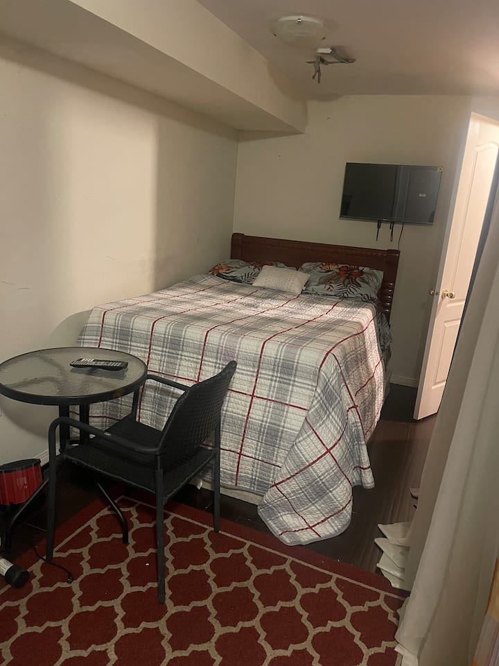Cabaña: habitación en el sótano con baño, a 10 km del aeropuerto
