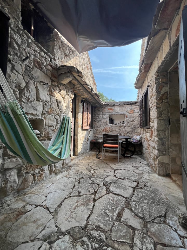 Romántica casa de piedra y patio cerca de una playa impresionante