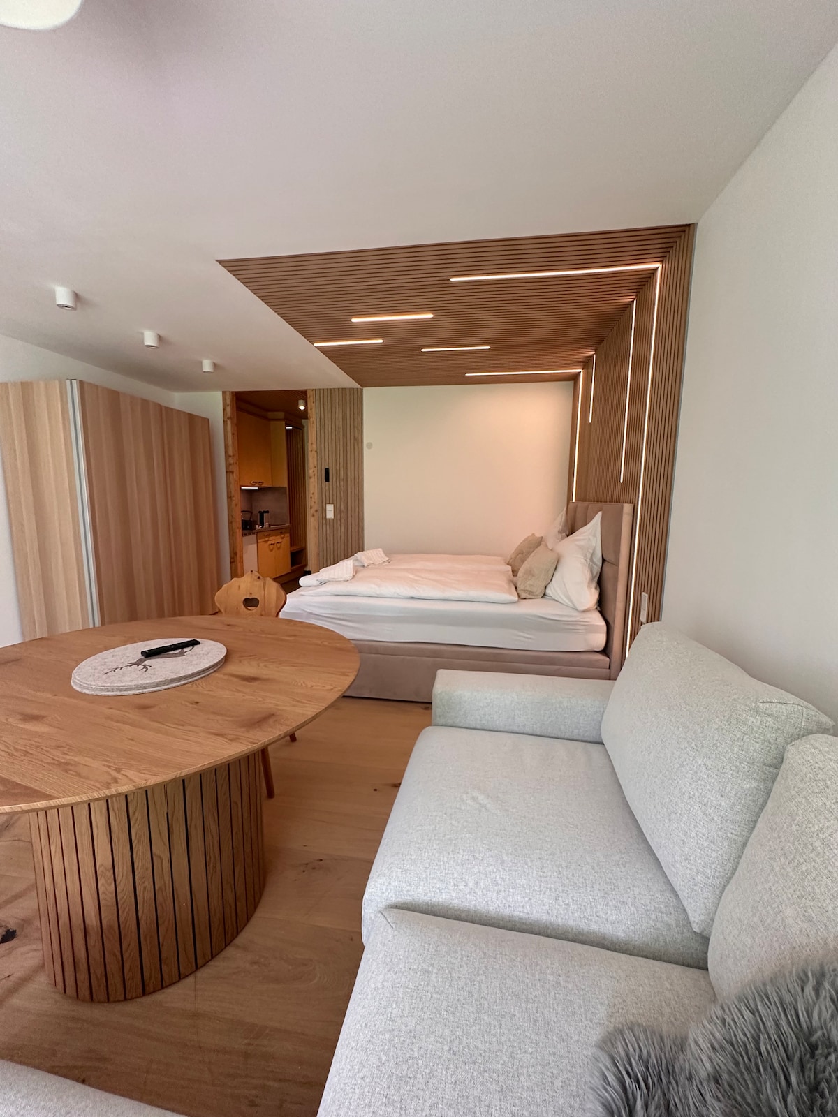 Tu relajación comienza desde el momento de tu llegada. Easy Check-In y tu propio aparcamiento subterráneo te están esperando. Luego, sube con el ascensor hasta el último piso. Entra en el apartamento Fitnessalm y siéntete como en casa en tu pequeño chalet. Siéntate y disfruta de las impresionantes vistas a las montañas en la terraza de 15 m², en la mesa del desayuno, en el cómodo sofá o en la acogedora cama de madera. Refréscate en la piscina de 18 metros de largo o haz unos largos.