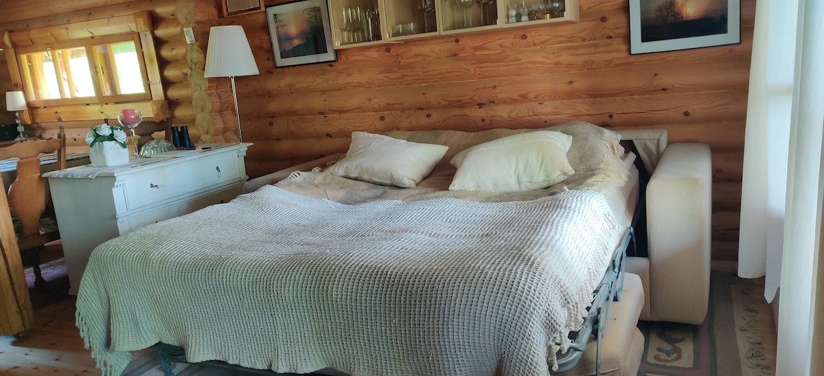 Cabaña electrificada con buenas vistas al lago. Terraza grande, cocina de verano, sauna exterior, balde (según lo acordado), varias fogatas, cocina de gas, parrilla de gas, nevera y armario con un pequeño congelador. Espacio para un grupo de 6 personas. Bote de remos con motor eléctrico. Agua corriente del lago. (La cabaña dispone de agua potable en bidones). Sauna con duchas eléctricas portátiles. Es posible pescar en el lago y cazar animales pequeños (previo acuerdo). Para los huéspedes que se alojen durante un largo periodo, se organizará un servicio de lavandería.