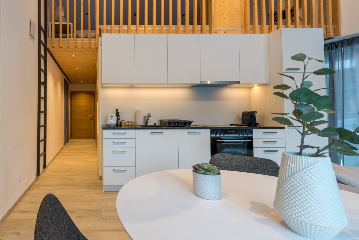 Estudio acogedor, moderno y acogedor. Ubicación ideal, tranquilo, a pocos minutos a pie del centro de la ciudad. Bonita vista de las montañas, balcón soleado desde la tarde hasta la puesta de sol. En la temporada de invierno apreciarás la proximidad de la Isla Snow para los niños o el servicio de traslado gratuito para llevarte a las pistas de esquí. De vuelta desde las alturas, ¡vamos a ponernos acogedores y disfrutar de la chimenea ! En verano apreciarás la proximidad de los 2 campos de golf. ¡Disfruta de la piscina y la cancha de tenis de la residencia !