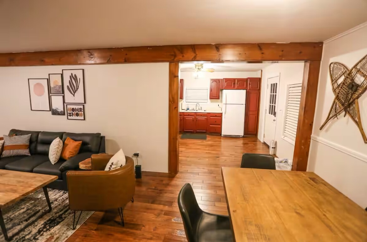 Esta granja "ELL" tiene el carácter de 1800, pero actualizada para los días modernos. ¡WiFi y aire acondicionado! Esperamos que este espacio te inspire. Vigas originales talladas a mano, suelos de pino, estufa de leña y bañera vintage para calentarte después de un día de esquí o deslizándote en familia por los campos. Mtn. bicicleta o caminar por los senderos. Terraza prvt con parrilla, patio vallado, chimenea y vistas. Estamos aquí las 4 temporadas @ "Windy Ridge Inn" ¡Senderos para motos de nieve en tu puerta! UNH, Dell Lea, Gunstock Mt, Laconia, Océano Atlántico, lagos NH, ME Outlets. A 90 minutos de Boston