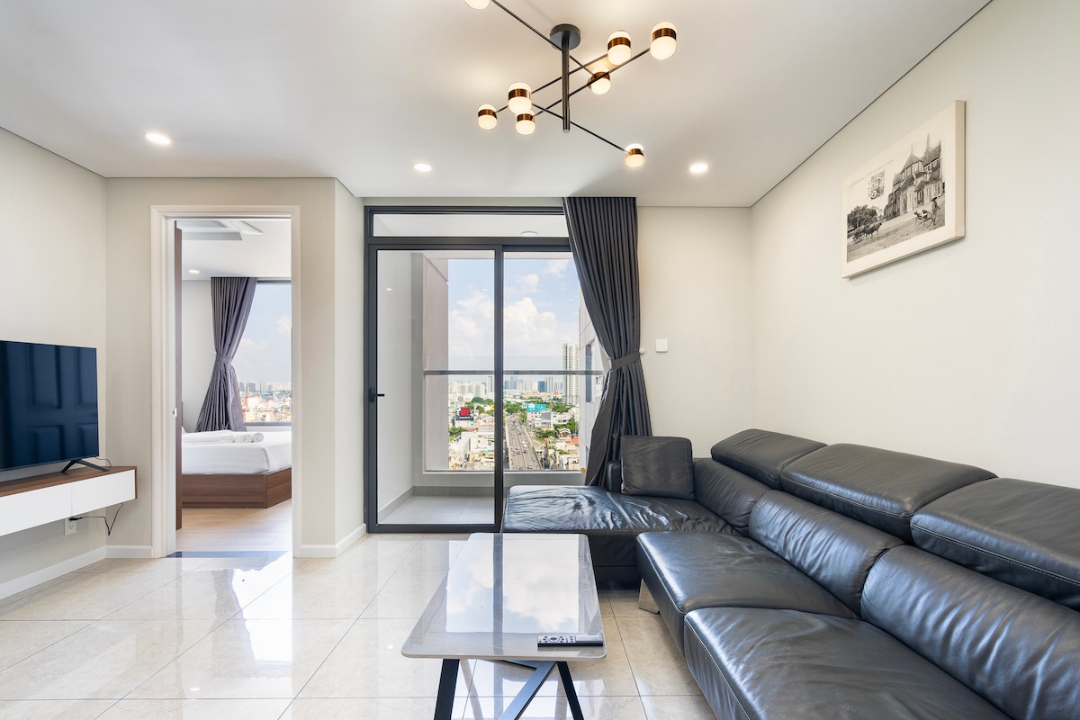 Elevated comfort and style in this luxurious 2-bedroom apartment, perfectly situated on a high floor with sweeping city views. Located near District 1, you're just minutes away from most iconic landmarks, including Ben Thanh Market, Notre-Dame Cathedral, Independence Palace,.. The apartment offers a quiet and peaceful retreat, perfect for families or groups of up to 4. It features 2 spacious king-size beds with high-end mattresses, complemented by elegant furniture and sleek modern appliances.