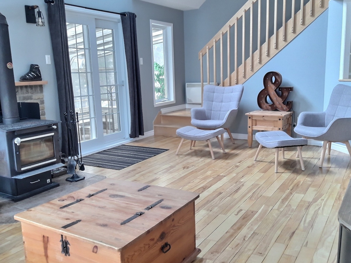 Nuestro chalet en el bosque nórdico es perfecto para pasar tiempo de calidad en pareja (o con un niño) o para un tratamiento de trabajo (con wifi de alta velocidad). El interior de madera es cálido y acogedor. Las ventanas de altura completa ofrecen unas vistas impresionantes sobre un valle boscoso. La cocina y la sala de estar de concepto abierto te mantienen en la conversación mientras cocinas. Si prefieres cocinar afuera, hay un fogón con parrilla y mesa de comedor al aire libre. A solo 70 minutos en coche de Montreal. El lago está a 25 minutos a pie si aparcas cerca.
