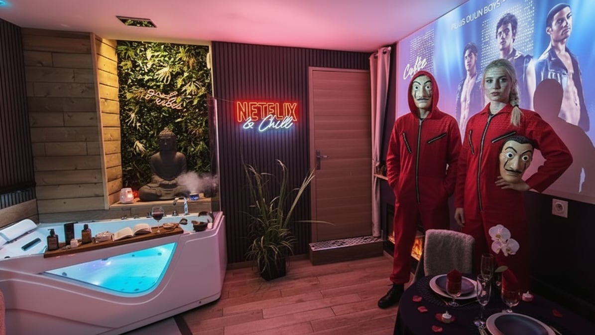 Plongez dans l’univers envoûtant de la suite Dark Mirror, un lieu pensé pour éveiller les sens, stimuler la complicité et vivre une parenthèse hors du commun. Profitez d'une nuit à deux avec baignoire balnéo/jacuzzi, lit Queen Size, miroir au plafond et des accessoires excitants qui surprendront votre partenaire et vous apporteront de nouvelles émotions et sensations fortes. Une suite où l’ombre caresse la lumière, où chaque détail murmure une promesse. Osez franchir le seuil...
