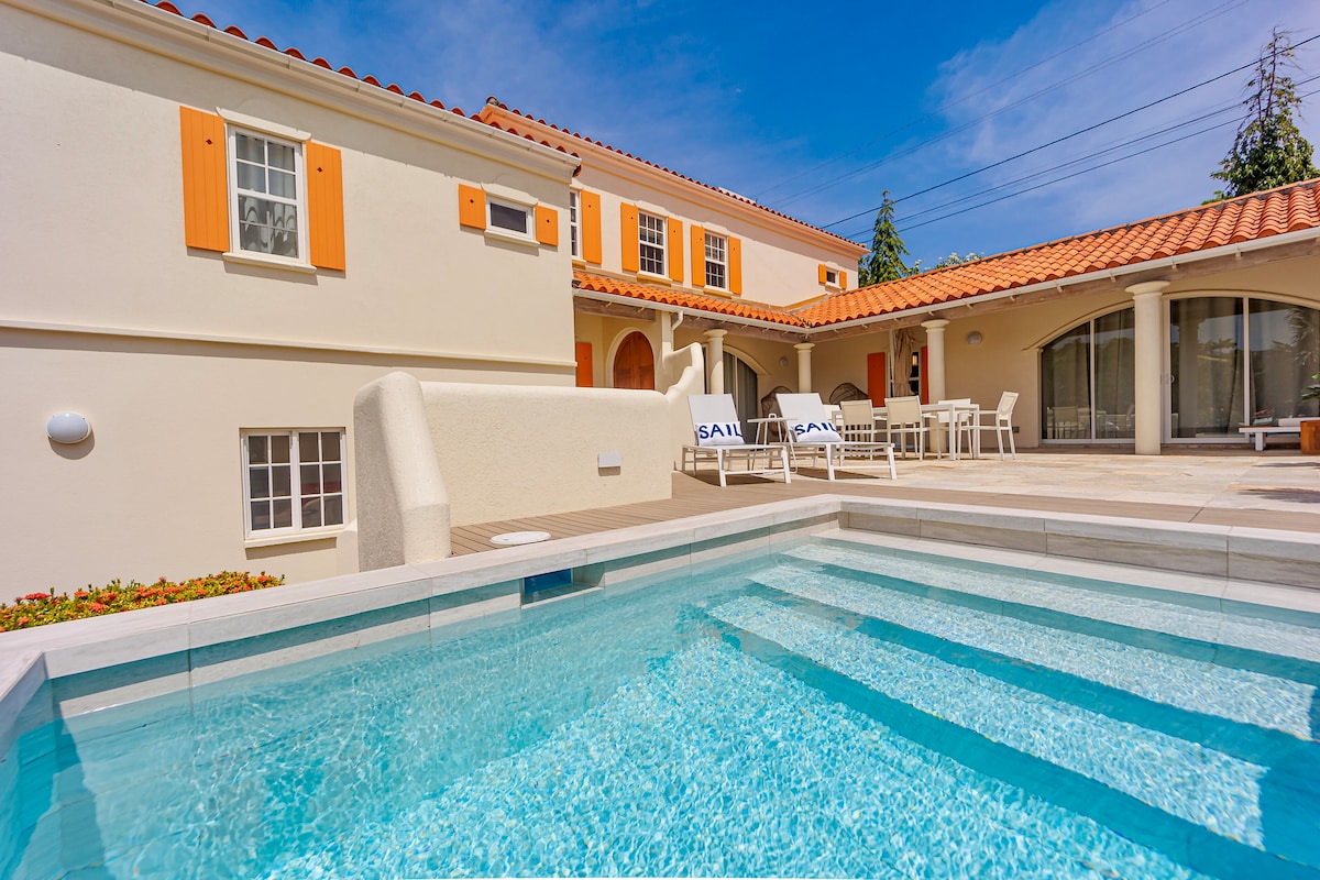 Stay in a striking villa with your own private saltwater pool and sun-drenched courtyard garden. Four bedrooms—each with AC and a private ensuite—perfect for families, friends, or groups. Retro diner dining, a cozy cinema corner, and a workspace round it out. Just 15 min from the airport with backup power, fast WiFi, and parking for 7. Comfort, privacy, and a stay you’ll actually remember.
