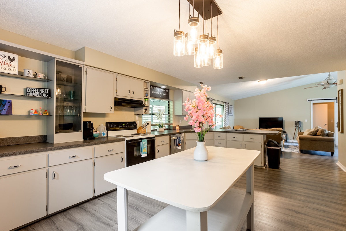 Trae tu equipo de pesca o tu pequeño barco para disfrutar de una divertida escapada en la casa del capitán con un muelle en el lago Stella. La entrada sin llave te permite realizar el registro de entrada de forma autónoma y te da la bienvenida a este cómodo y limpio espacio de 962 pies cuadrados con dos camas tamaño queen, un baño, cocina completa, sala de Florida y un patio trasero vallado. Se proporciona un bote de remos. ¡También hay tres kayaks y dos bicicletas disponibles! ¡O puedes traer tu barco e ir a pescar! Disfruta nadando, de preciosas puestas de sol y paseos por el hermoso lago.