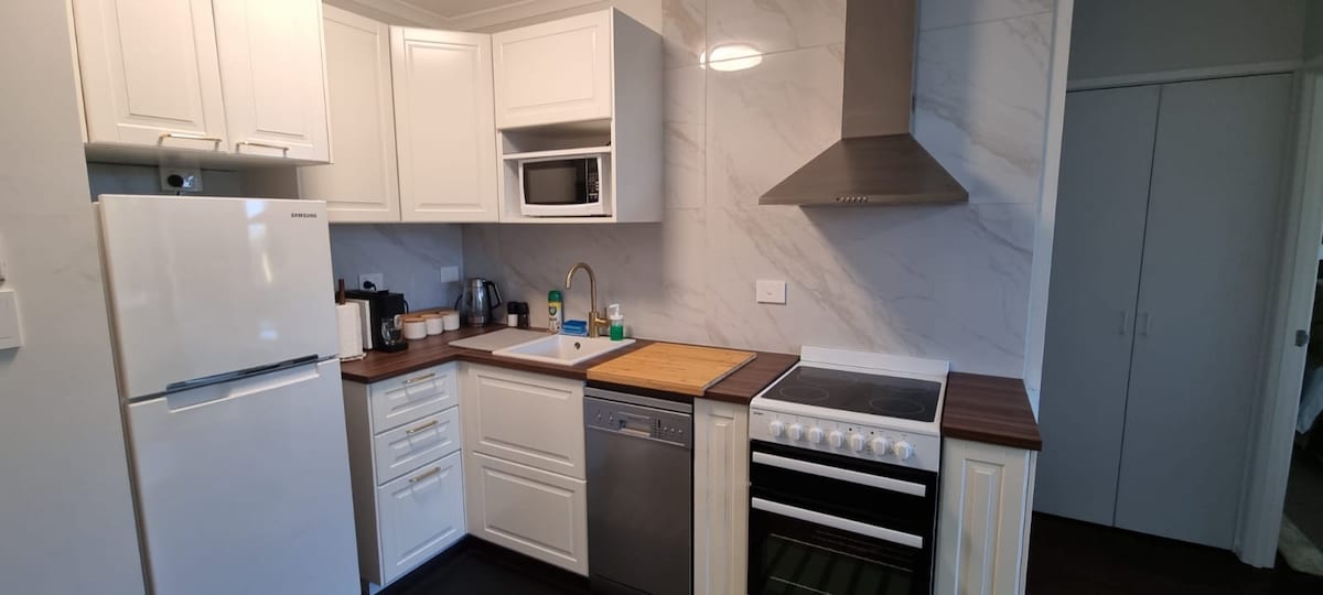 This is the private, self-contained guest suite of a large, busy family home. Our property has a shared secure entrance from the street and the guest suite has its own entrance door, deck, travertine shower, separate toilet, kitchenette with mini-bar fridge and a small built-in robe. Queen-size bed, wall-mounted smart TV, reverse cycle air-con and a small BBQ on the deck. Laundry facilities available if you need. Minimum 2-night stay and 13% discount for 7 nights or more. Free street parking!