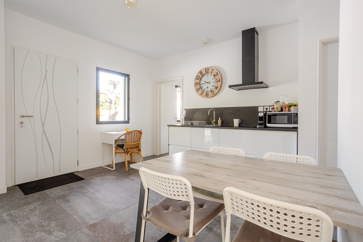 Relájese en este alojamiento tranquilo y elegante. Casa totalmente independiente que consta de: Salón con cocina, 2 dormitorios con camas de 160, 1 baño con inodoro. Cuna disponible si es necesario. Podrá disfrutar de una bonita terraza con zona de comedor y barbacoa, sin vecinos. Estamos idealmente situados, entre Burdeos, la cuenca de Arcachon y Biscarrosse, a unos 30 minutos de cada una de estas ciudades Fácil acceso a las tiendas, pero es necesario disponer de vehículo. Acceso rápido a la A63.