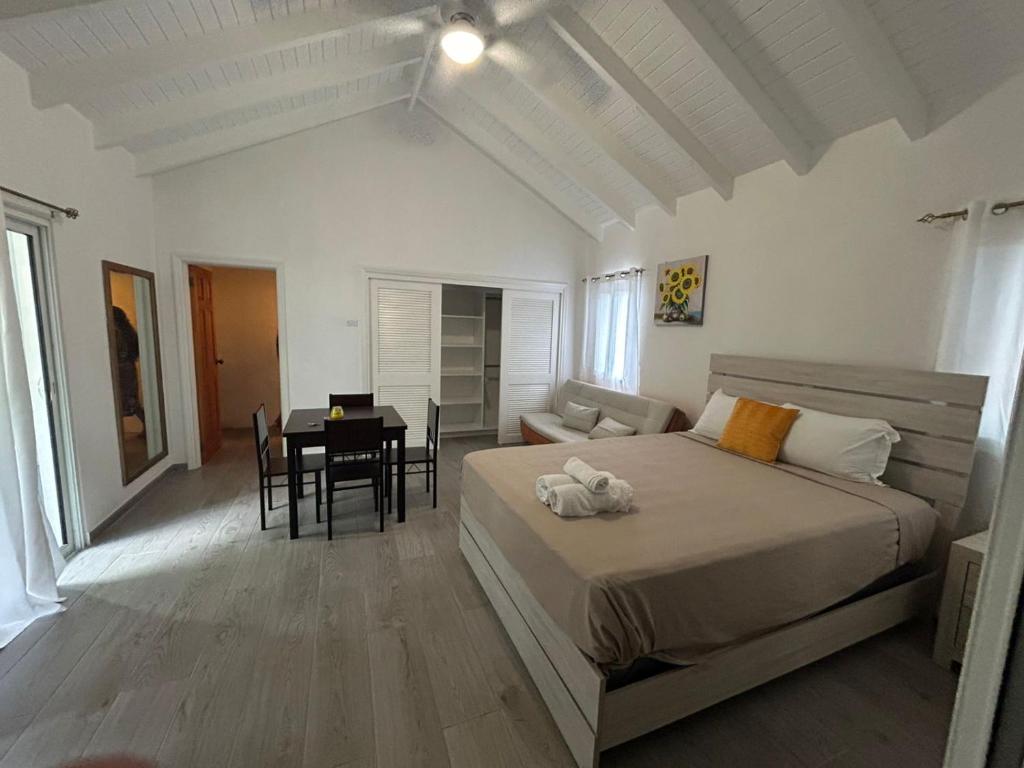Moderno apartamento de lujo de 1 dormitorio separado de la casa principal. Generador de energía de respaldo. Suelos de mármol en todas partes. Todos los electrodomésticos son de acero inoxidable en una cocina de tamaño completo. Wifi gratuito en el interior y en la azotea. TV vía satélite. Sofá cama tamaño queen adicional en el salón con capacidad para 2 personas. Lavadora/secadora. A 90 pasos de la hermosa playa de Simpson Bay. Azotea privada con vistas de 360°. Parrilla, nevera y fregadero en la terraza. Tumbonas, toallas de playa, sombrilla y neveras. Aparcamiento justo fuera de la puerta. Masaje in situ disponible.