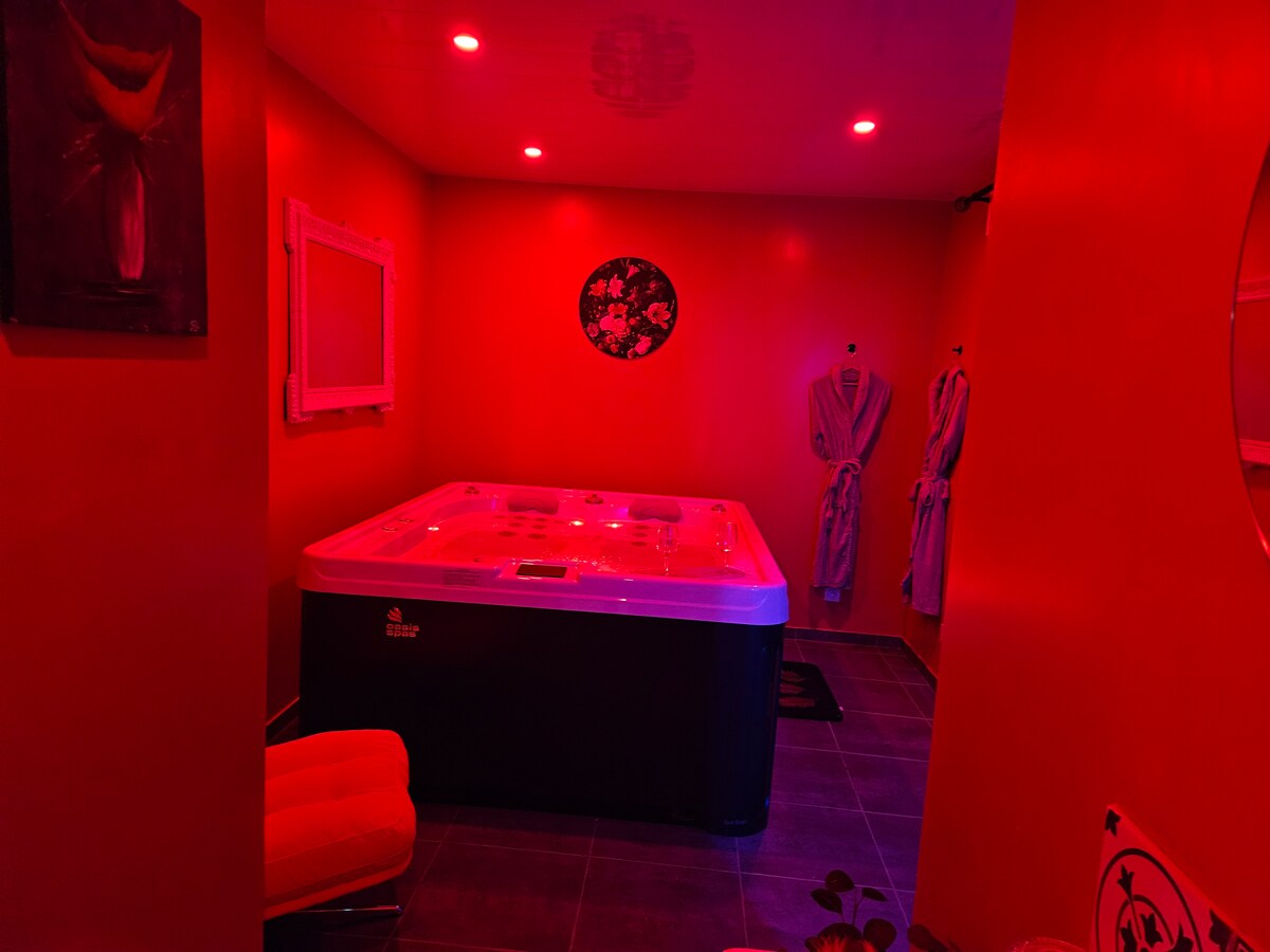Apartamento con jacuzzi, mesa de masaje y terraza. El alojamiento se compone de una cocina totalmente equipada con microondas, cafetera, tostadora, placa de cocción y refrigerador. Luego se compone de un área de relajación con un jacuzzi para dos personas y una mesa de masaje. Un espacio nocturno muy cómodo con una cama tamaño king y una gran pantalla. Y para terminar, encontrará un baño con ducha y un inodoro separado.