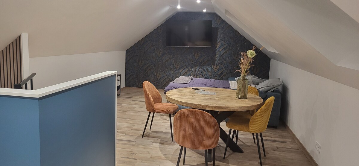 Profitez d'un logement entièrement rénové. Ce logement possède une très jolie chambre avec sa propre douche italienne. Tout est neuf: literie, douche, lave-vaisselle, lave-linge, cuisine, vaisselle, frigo, cafetière avec filtres et café à disposition. Idéal pour couple avec ou sans bébé ou d'une personne seule.. Possède un lit deux places, un lit parapluie et un canapé non convertible. Appartement situé au rez-de-chaussée, au bord de la route. Place de parking gratuite devant le logement.
