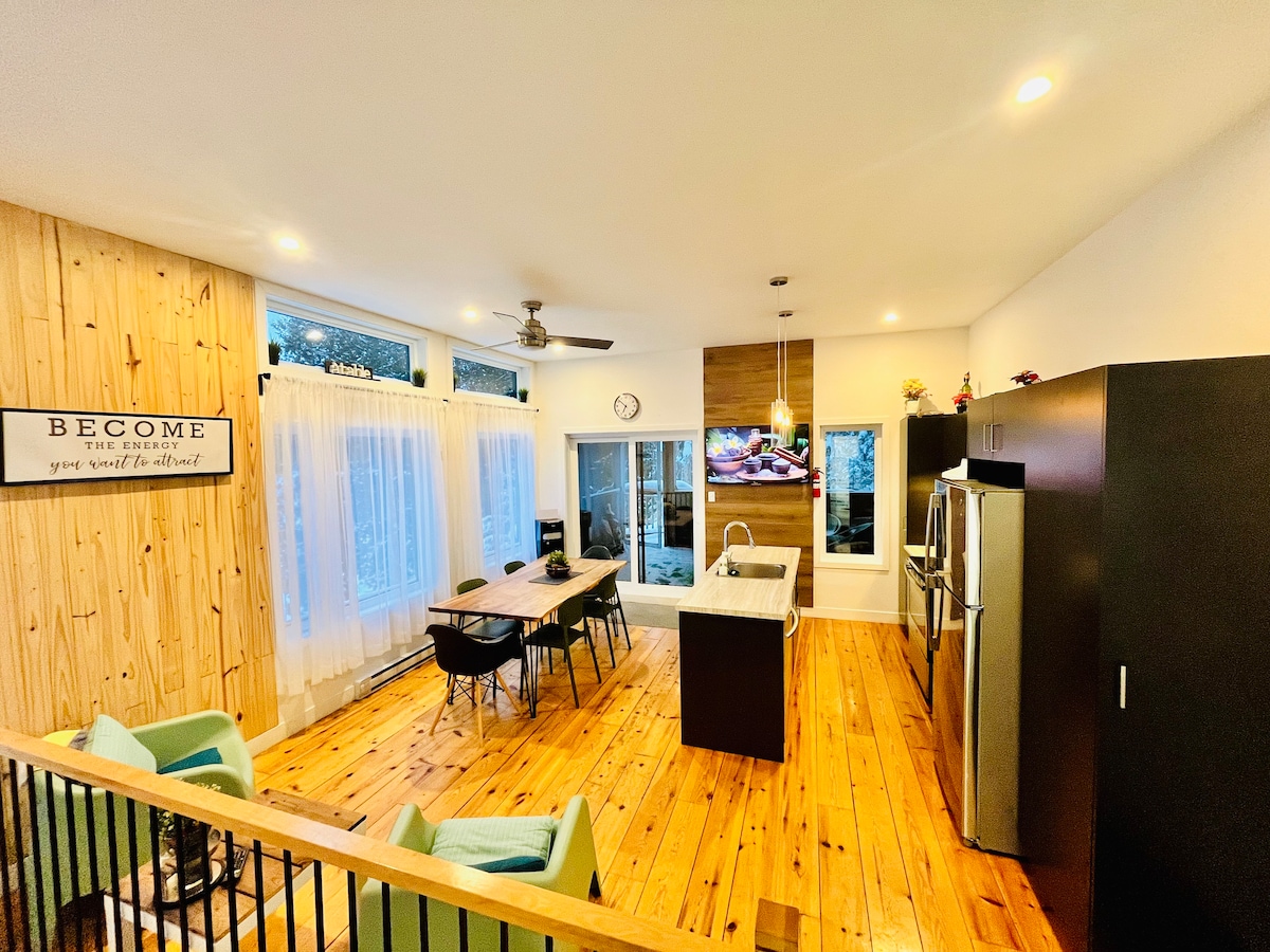 ¡El chalet de l'Orée du Bois Joli se encuentra en Val-David y tiene una vista que domina la copa de los árboles! ¡Instálate en el spa para observar las estrellas! Camine con raquetas de nieve por la propiedad de un acre que bordea las laderas del Monte Alta. ¡Relájese en nuestra hamaca gigante interior y disfrute de la magia de este refugio de madera! Senderismo, pistas de esquí, tres hermosas playas y muchas actividades y atracciones de los alrededores te esperan.