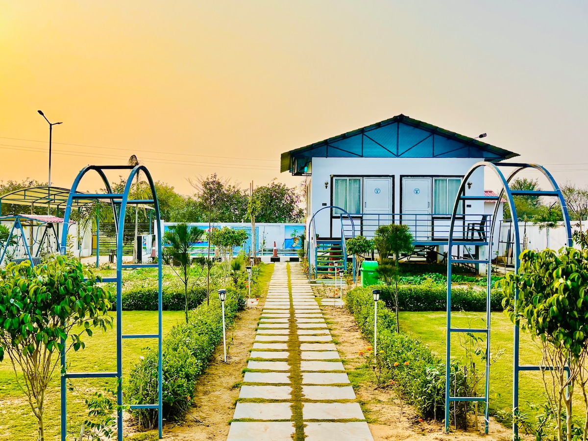✨ Acerca de la estancia Escápate a la naturaleza con esta cabaña rústica ecológica, rodeada de vegetación. Perfecto para parejas, viajeros solitarios y grupos pequeños que desean relajarse, trabajar de forma remota o simplemente disfrutar de la tranquilidad de la vida en el campo. Despiértate con el canto de los pájaros, toma tu té de la mañana y contempla la puesta de sol con una hoguera bajo las estrellas. A solo 20 minutos de la ciudad de Jaipur. 🛏 Qué te encantará • Cabaña de madera con aire acondicionado y baño • Área apta para trabajar • Asientos en el jardín al aire libre • Hoguera y cabaña en el árbol para las noches