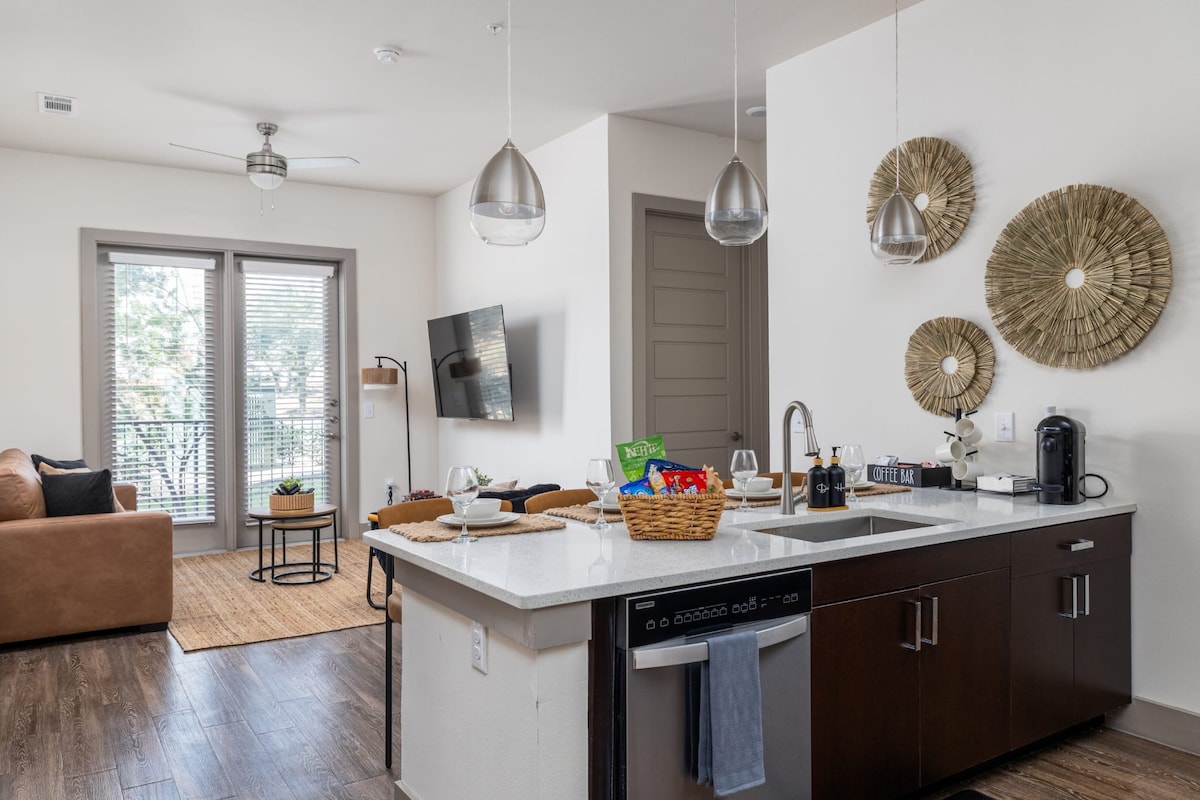 Nuestro acogedor apartamento de 1 dormitorio es el refugio perfecto para parejas o viajeros solitarios que buscan comodidad y conveniencia. Entra y relájate en la sala de estar bellamente decorada, completa con un televisor Roku 4K de 55", ideal para noches de cine o para ponerte al día con tus programas favoritos. El acogedor dormitorio cuenta con una lujosa cama tamaño queen, un escritorio dedicado para la productividad y un amplio espacio en el armario para todas tus pertenencias. Disfruta de una amplia bañera de jardín y doble tocador, diseñados para que tu estancia sea relajante.