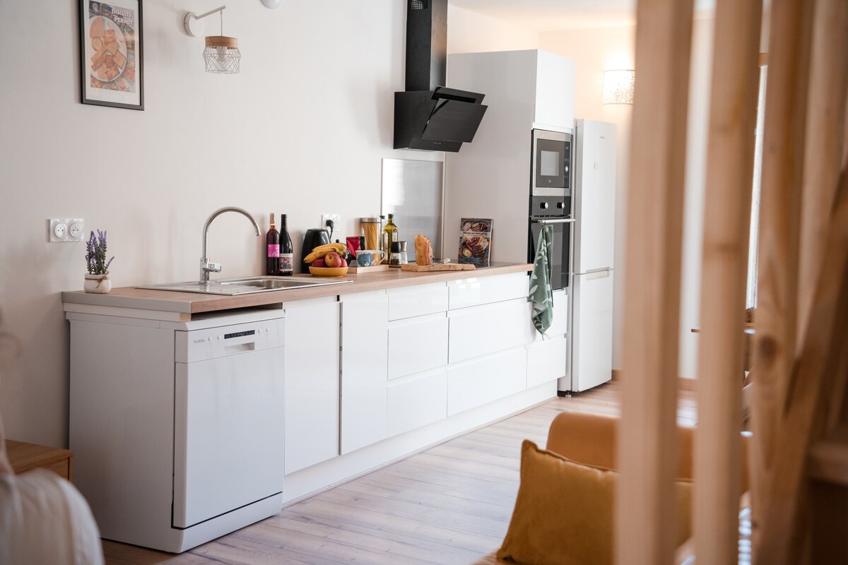Relájese en este alojamiento tranquilo, luminoso y de diseño. El espacio abierto llama la atención, pero también la decoración y el mobiliario, en un ambiente acogedor. Estoy a 5 minutos a pie de la estación de tren y a pocos minutos de las tiendas del pueblo: Spar, Carrefour City, banco, correos, estanco, farmacia, panadería. Cerca de mi casa también se encuentran la magnífica Fortaleza de Salses construida en el siglo XV, y el estanque de Salses Leucate, un bonito rincón de naturaleza para pasear.
