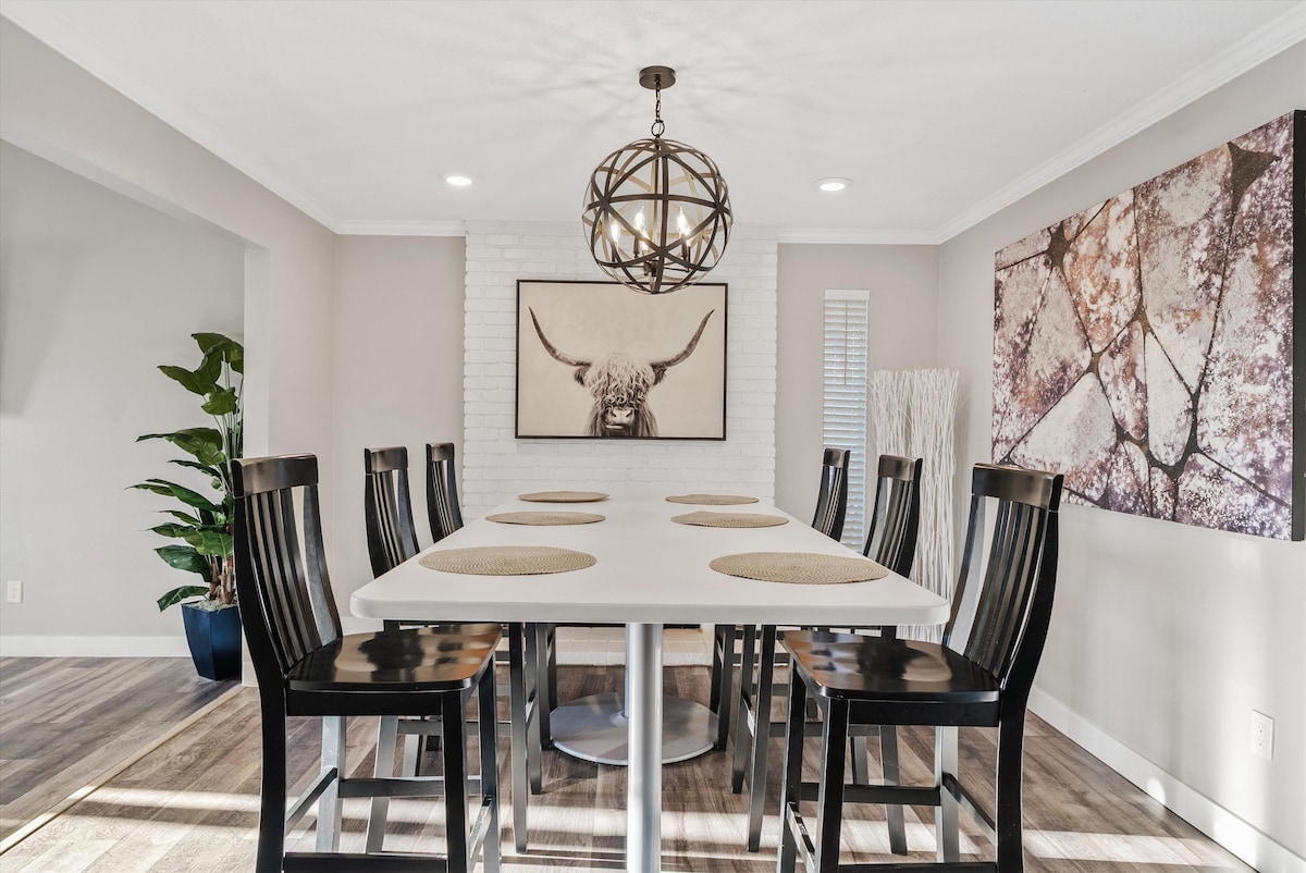 🏊 Relajación durante todo el año en la piscina de agua salada climatizada y en el spa (suave para la piel y los ojos) 🔥 Póngase cómodo con las funciones de fuego 🍳 Cocina totalmente equipada + parrilla de propano al aire libre 🎱 Sala de juegos con mesa de billar, futbolín, dardos y televisor de pantalla grande 🌞 Comedor y bar al aire libre para disfrutar del clima de Arizona 📺 Televisión al aire libre para ver partidos/películas mientras se disfruta del spa 🚗 Fácil acceso a 2 autopistas principales 🎨 Decoración artística y única Escapada estilo resort en Phoenix (correo para Glendale): ideal para familias, viajes de golf y vacaciones