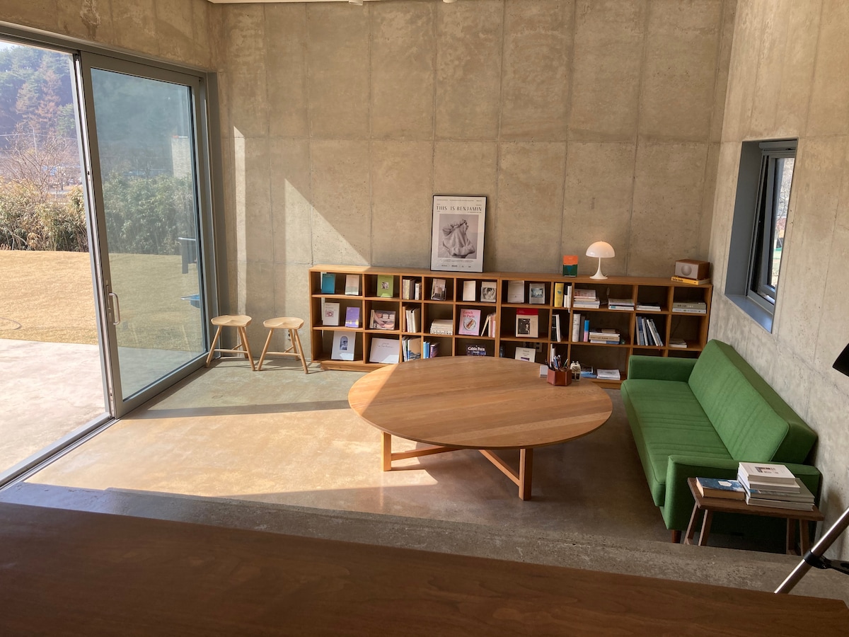 Pyeongchang, Gangwon-do, el mejor lugar para tomar un descanso a una altitud de 700 metros. ¡Un verdadero recorrido por el campo con nada más que montañas y nubes, algunas casas privadas y huertos de tierras altas! ¡Pero hay mucho para alguien! Dos habitaciones tamaño queen con pinturas, música analógica y libros, una amplia sala de estar y una gran terraza abierta a la naturaleza. ¡Una casa de campo con agua clara y aire, estrellas en el cielo nocturno y tranquila! Si tomas un autobús con destino a Ungyo desde la terminal de Dong Seúl, ¡llegará en una hora y media! * El centro vacacional de esquí WELLI HILLI está a 20 minutos en coche. * ¡Reservación prioritaria para 4 personas o más los sábados, días festivos y temporadas de vacaciones! * Entrada autónoma básica. * ¡+ TV y Netflix disponibles! * La estación de esquí más cercana está a 20 minutos en coche de Welli Hill Street. * Para las estaciones de tren, toma un taxi después de usar la estación de Dunnae en lugar de la estación de Pyeongchang. * Un pueblo de montaña casi siempre atrapado en la nieve blanca en invierno. Sin embargo, excepto en casos especiales, la reconstrucción se lleva a cabo para que los autos puedan llegar al estacionamiento cerca del alojamiento.