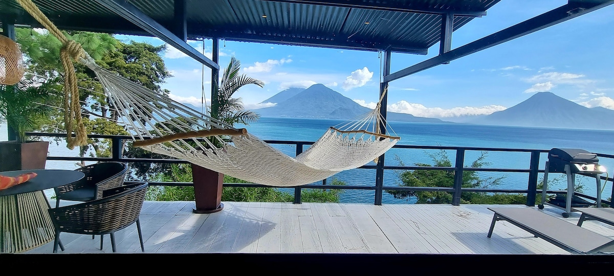 Very Unique & Modern Luxury House up in the Guatemalan Highlands with the sensation of floating up in the sky (1700m) -Features unobstructed Starlink connection with 24 hours of unbroken electricity (lithium/solar) -All windows folds fully open to greet the breathgiving views of 5 vulcanos and the “infinity lake” of the ever changing “painting” -Filtered spring water on tap -Bathroom hot tub for a closed or open door experience -12 m2 cantilevered hammock deck-net for stargaze & relaxation