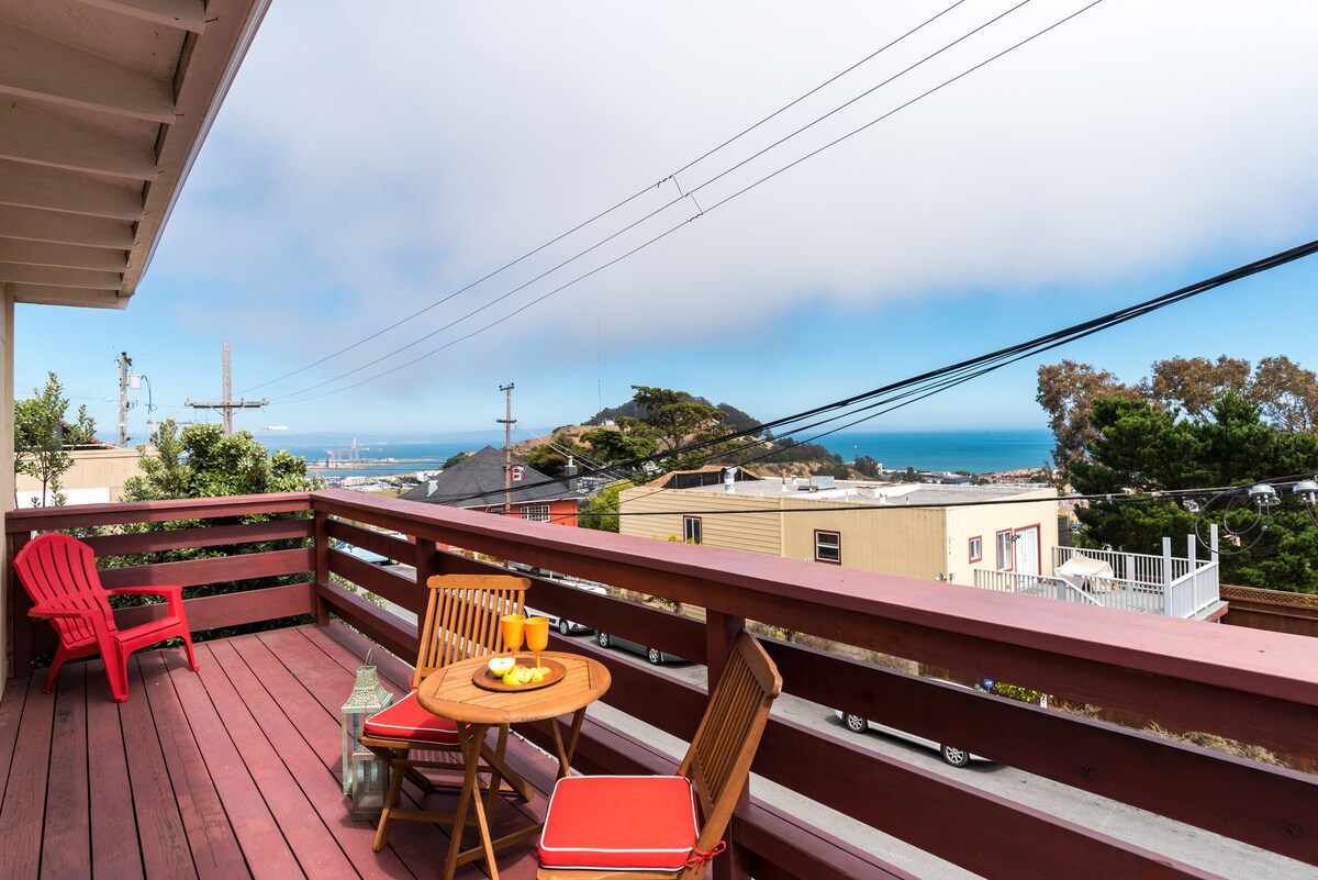 Todo el mundo te agradecerá que los hayas traído a este apartamento limpio, espacioso, privado y totalmente equipado. Camas tamaño king. Amplios espacios de comedor y sala de estar. Cocina de acero inoxidable. Balcones con vistas románticas al Área de la Bahía. Patio con jardín privado y jacuzzi. 2 televisores. Cine. Muebles de alta calidad. Impecablemente limpio. Todo lo que necesitas. Ubicada en un barrio tranquilo, pero a solo 20 minutos del Centro Cívico, el aeropuerto de San Francisco, el puente Golden Gate, museos y playas.