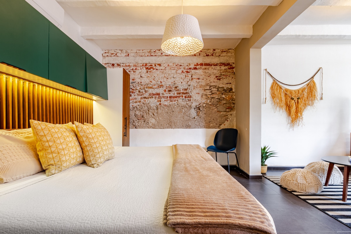 Casa Dos Cuervos en el centro de Querétaro. Disfruta de una experiencia única en nuestra suite diseñada por un estudio de interiorismo. Cuenta con una cama king, aire acondicionado, una cocineta equipada y un baño independiente. En la planta alta encontrarás una suite amplia con cama king, aire acondicionado, televisor y zona de home office. Siempre limpio y listo para recibirte. Vive la ciudad de Querétaro como un local en un espacio exclusivo y confortable.