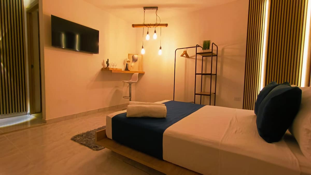 Disfruta un apartaestudio de lujo en el corazón de San Javier, Medellín. Moderno, cómodo y con una decoración única. Ideal para parejas o viajeros que buscan confort, estilo y buena ubicación. A pocos minutos del metro, graffitour y cafés locales. WiFi rápido, cocina equipada y un ambiente que te hará sentir como en casa. Tiene un supermercado en el primer piso del edificio. ¡Vive Medellín con estilo! Actualmente tiene estufa eléctrica