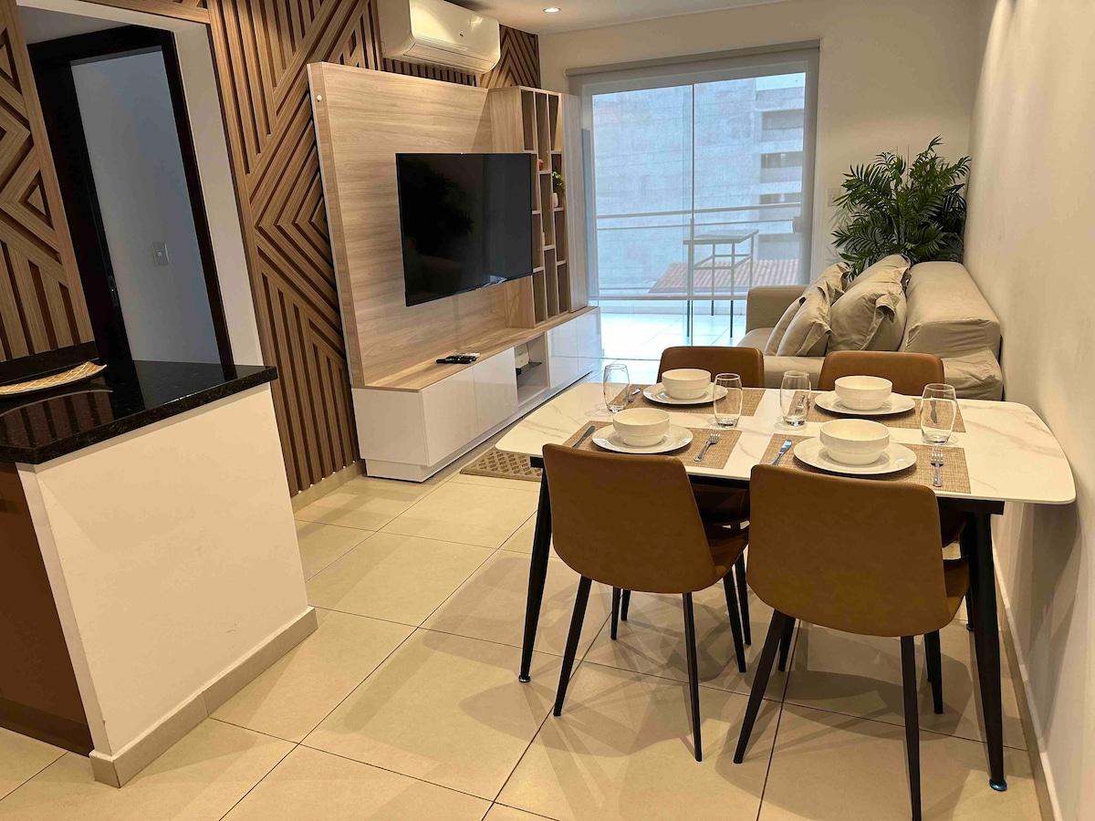 Hermoso y acogedor apartamento listo para que disfrutes de tu estancia en Asunción durante unos días o unos meses. Todo lo que necesitas está incluido. A pocos pasos de Shopping Villa Morra/Mariscal, supermercado y muchos restaurantes. Uso de piscina en la azotea, barbacoa y gimnasio. Amplio balcón con unas vistas increíbles. Wifi, ropa de cama, cocina y todo lo necesario para que te sientas como en casa.