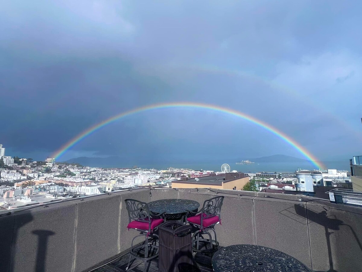 Very private 2BR unit perched on Telegraph Hill, but just one block from the heart of North Beach. The unit is filled with art, light, views and beauty. But then go upstairs - and enjoy the largest private rooftop in the area (over 1000 ft.²), with 360° views. Visitor here to see the best of the City? In SF on business? Local but need a staycation? For all of you, this is your place. Over 165 5-star reviews - many say this was their favorite SF locale ever. Make it yours . . .