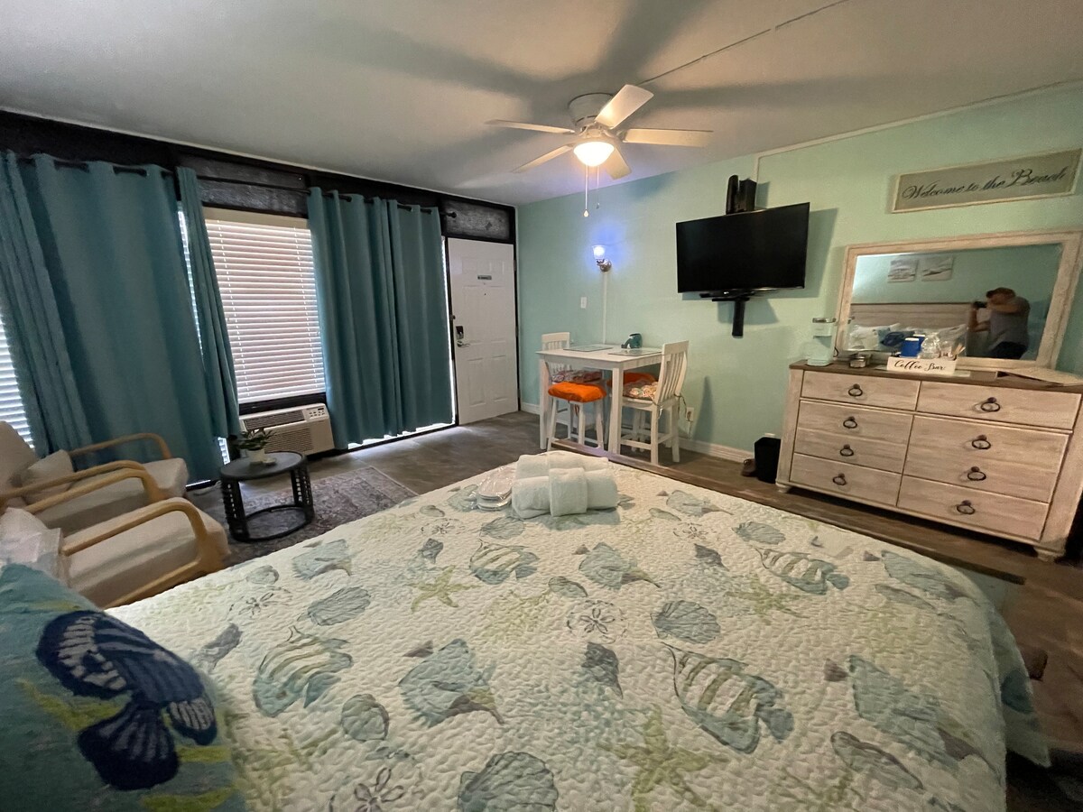 A pocos pasos de la playa, ven a disfrutar de tu estancia en este acogedor refugio con vistas al mar. Tómate tu taza de café o disfruta de una buena cena mientras observas el amanecer/atardecer en el balcón. Esta linda joya está cerca de muchos bares/restaurantes. Carrito de golf disponible y recomendado a la tarifa más baja de la isla con alquiler de condominios. Esta suite 1/1 king tiene un nuevo colchón de espuma viscoelástica, un sofá/cama futón y 2 televisores inteligentes. Sillas de playa y equipo incluidos.
