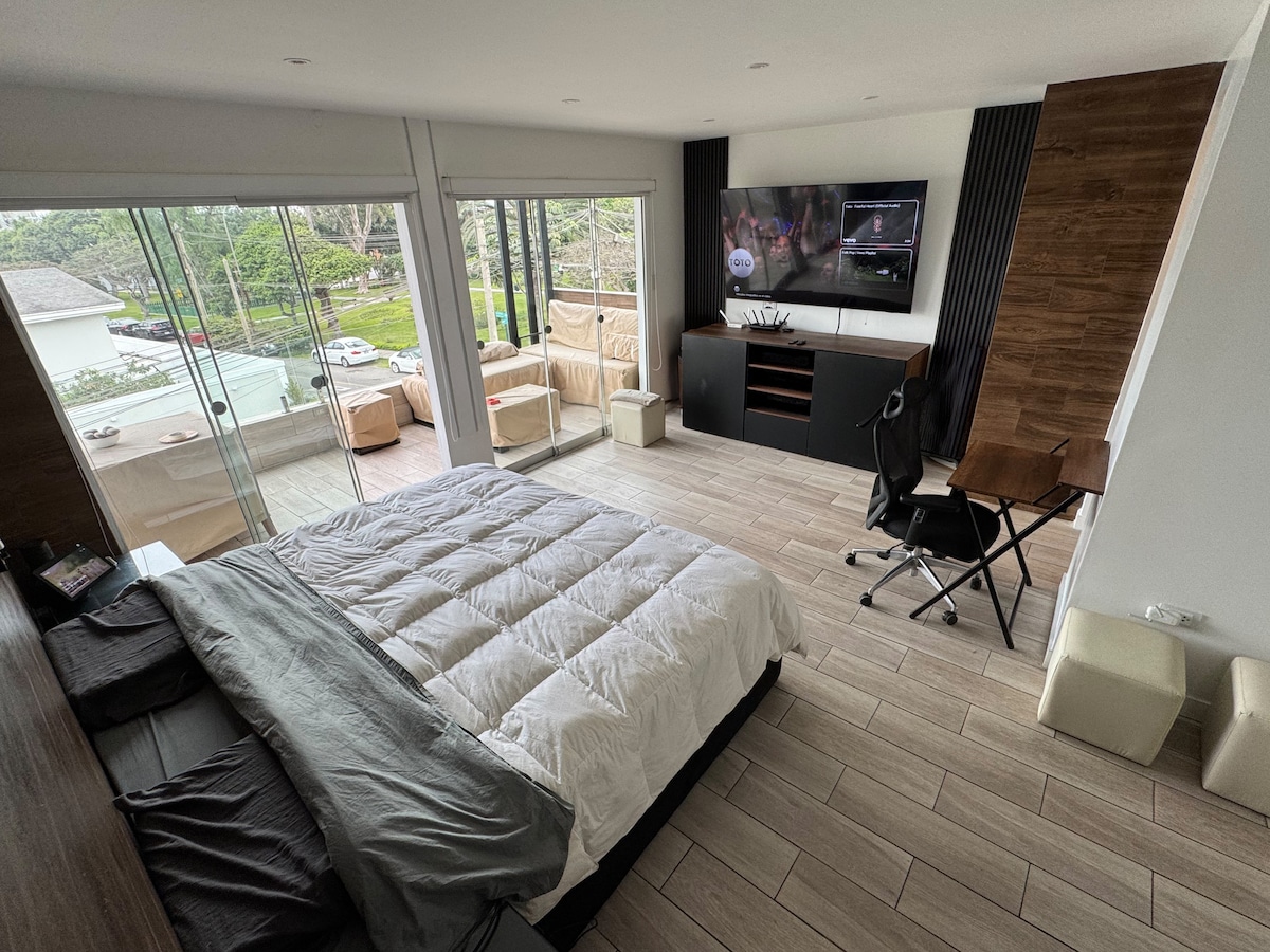 Mini depa privado e independiente en segundo piso (acceso con escaleras) completamente amoblado, consta de tres ambientes: Dormitorio con cama queen size, amplio closet y escritorio, Wifi fibra óptica, Smart TV 50” con WinTv, tiene vista a la piscina, jardín y parque. Cocina/comedor, 1 sofá cama y al lado baño completo privado. El barrio es tranquilo y seguro. Vigilancia privada. Cerca de avenidas con trasporte público, hay lavanderías, banco BCP, bodegas, restaurantes y farmacias.