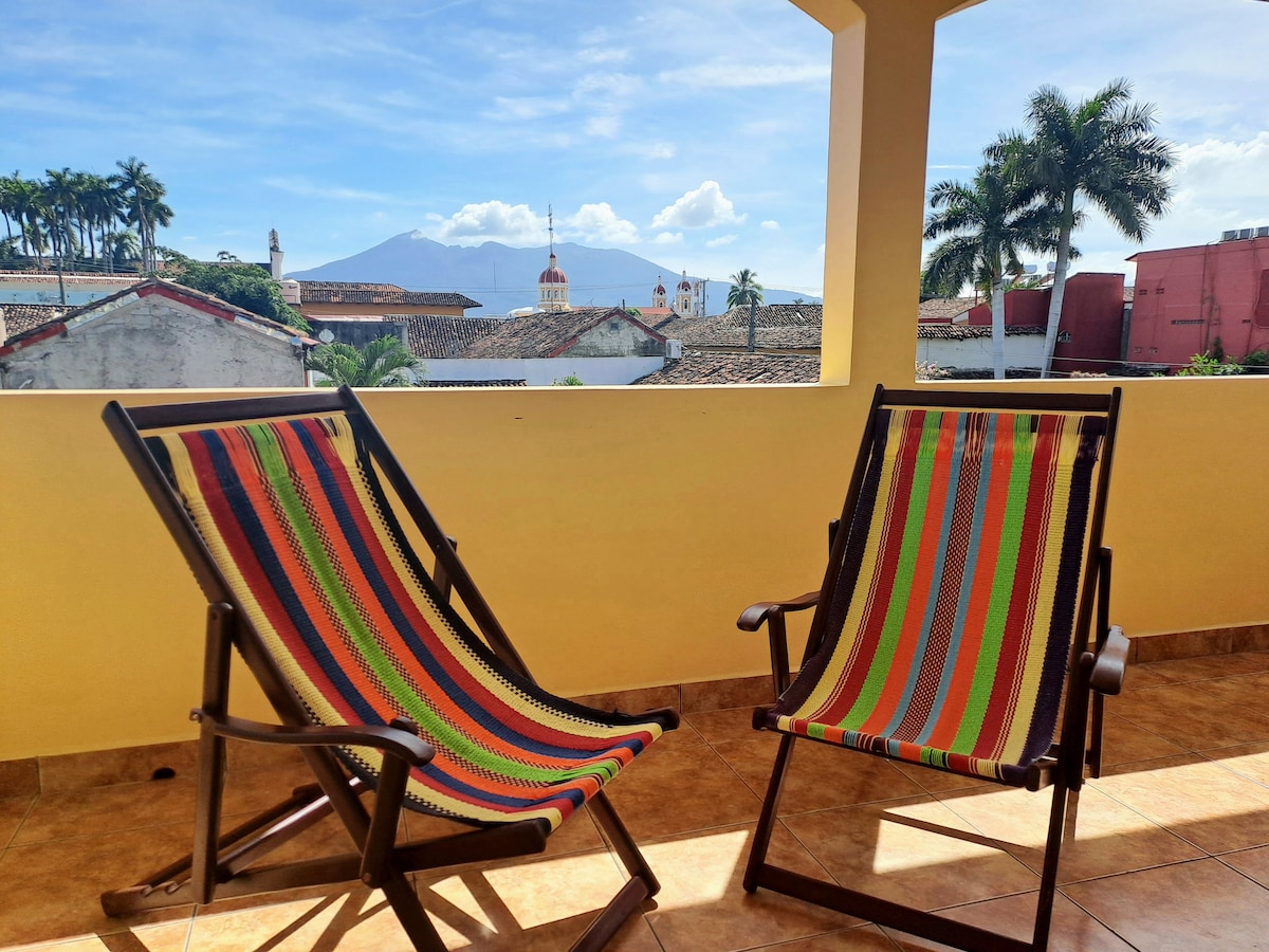 ¡Descubre la Granada colonial con Tesoro Dorado! A solo 3 manzanas de Central Park y la catedral de Granada, esta luminosa casa colonial cuenta con una impresionante piscina central abierta al cielo. Disfruta del gran salón, el comedor junto a la piscina y la cocina totalmente equipada. Los 3 amplios dormitorios tienen aire acondicionado y baño privado. Mucho espacio para que las familias numerosas se extiendan y disfruten. Relájate en la terraza de la planta superior con vistas al volcán y a la catedral. ¡A poca distancia de los restaurantes y la vida nocturna de la calle la Calzada!