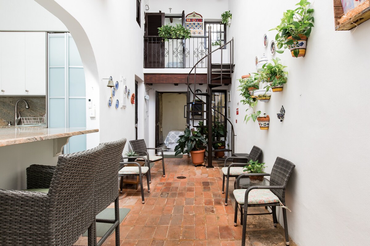 Entra por puertas dobles resistentes y recorre los azulejos de terracota para admirar un atrio lleno de plantas. Pase bajo un arco para preparar comidas en una casa colonial histórica. Duerme en habitaciones con aire acondicionado después de explorar sitios culturales cercanos. Puerto Rico ha sido ahorrado los peores efectos de la pandemia de Covid-19 por nuestra pronta acción en la aplicación de medidas de seguridad. Por tu seguridad, seguimos todas las regulaciones de los CDC, PR Tourism y Airbnb en materia de limpieza y desinfección. Consulta discoverpuertorico.com para obtener más información sobre las regulaciones gubernamentales que debes cumplir antes y durante tu estadía. La casa está totalmente reformada, con techos altos, arcos y un patio interior clásico español. Hay muchos toques decorativos y el uso liberal de las plantas crean un ambiente tropical que invita a la relajación. Tendrás acceso total a la casa. Te proporcionaremos una descripción detallada e instrucciones de todas las instalaciones de la casa, incluido el funcionamiento de todos los electrodomésticos, como lavadora / secadora, lavavajillas y microondas. También se incluirán instrucciones para todos los controles remotos: cajas vía satélite, televisores inteligentes de alta definición y aire acondicionado. Estaremos disponibles por teléfono celular, mensajes de texto y mensajes de Airbnb para responder a todas tus preguntas sobre las instalaciones de la casa y proporcionarte información turística como restaurantes que recomendamos, lugares para visitar, tiendas, excursiones para tomar, recorridos a pie para hacer por tu cuenta, lugares de música, etc. Ofrecemos una guía detallada con fotos. Además, podemos organizar guías certificados y expertos para que te lleven a recorridos por el Viejo San Juan y otras áreas de la isla, incluidas las playas del área de San Juan, y muchos recorridos orientados al medio ambiente. La casa está en el Viejo San Juan. Es de fácil acceso a lugares importantes como La Puerta de San Juan, Fuerte Español El Morro, La Rogativa, La Princesa, Ballaja, Museo Las Américas, Museo de la Ciudad, La Fortaleza, Plaza de Armas y Calle Cristo. El Viejo San Juan está construido para caminar. No necesitarás un auto mientras estés en el Viejo San Juan. Si necesitas salir del Viejo San Juan, puedes conseguir un taxi en una parada de taxis cerca de la casa, o usar Uber. Si tienes un grupo grande, podemos organizar el transporte grupal. Si alquilas un auto, el Viejo San Juan tiene una variedad de estacionamientos públicos y un sistema de tranvía para ayudarte a moverte por el área durante el día. Consultá para obtener más información. Si después de tu visita sigues viajando en un crucero para visitar otras islas del Caribe, es posible que puedas caminar hasta tu barco, ya que muchos barcos comienzan su viaje desde el puerto en el Viejo San Juan. O bájate de tu barco y quédate con nosotros unos días para disfrutar de esta maravillosa ciudad.