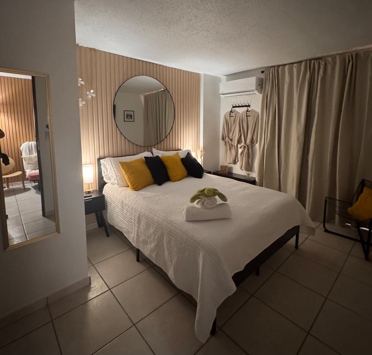 Studio apartment with one full bed, and folding mattress for 2 children's , sofa refrigerator, microwave, coffee maker, toaster, eating area, includes continental breakfast, private bathroom, toilet paper, bath and hand soap, bedding, pillows, towels, Wi-Fi, television, air conditioning, carbon monoxide and smoke alarms, fire extinguisher, first aid kit, emergency plan, open terrace, basketball and tennis courts, recreational park, parking, located in an exclusive place.