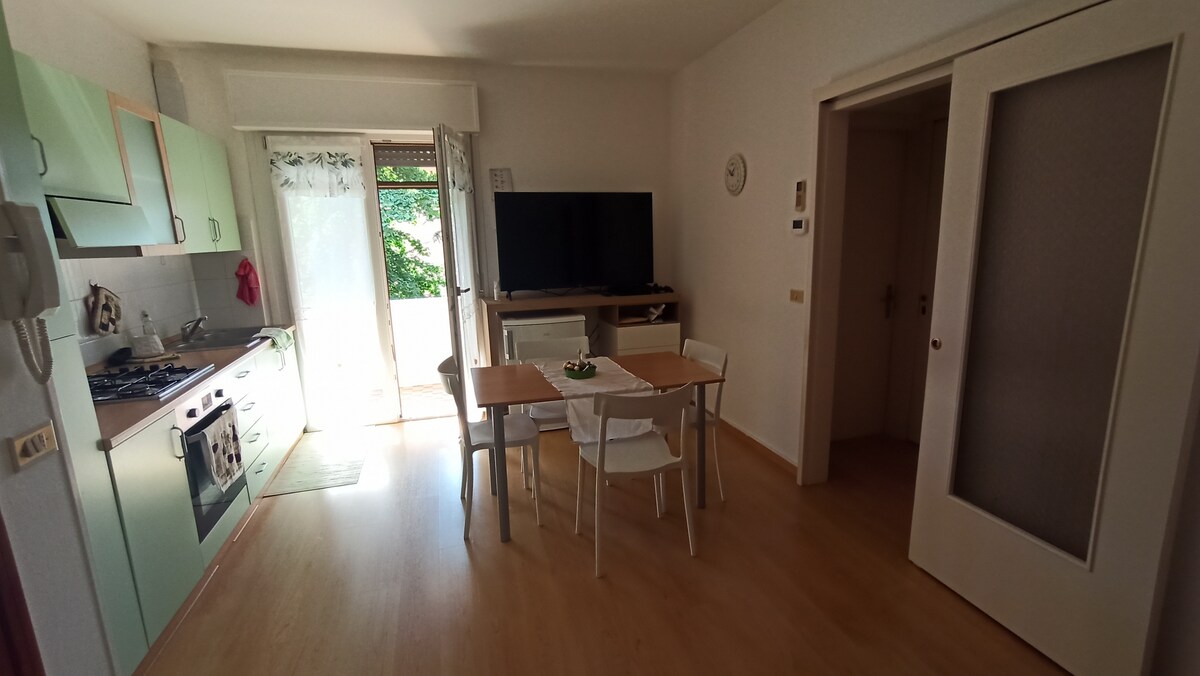 Bonito apartamento con aire acondicionado, lavadora y espacio exterior. A 100 metros de una parada de autobús y una tienda que vende frutas y verduras frescas y comestibles todos los días. Si te interesa la comida y los vinos locales, podemos darte algunos consejos sobre tiendas y granjas cercanas. Supermercado más grande abierto 7/7 a menos de 10 minutos (a pie). El castillo de la ciudad (en Prosecco Hills) está a 20 minutos a pie. Vivimos cerca, hablamos italiano, pero nuestros hijos nos ayudan a dar la bienvenida a huéspedes extranjeros.