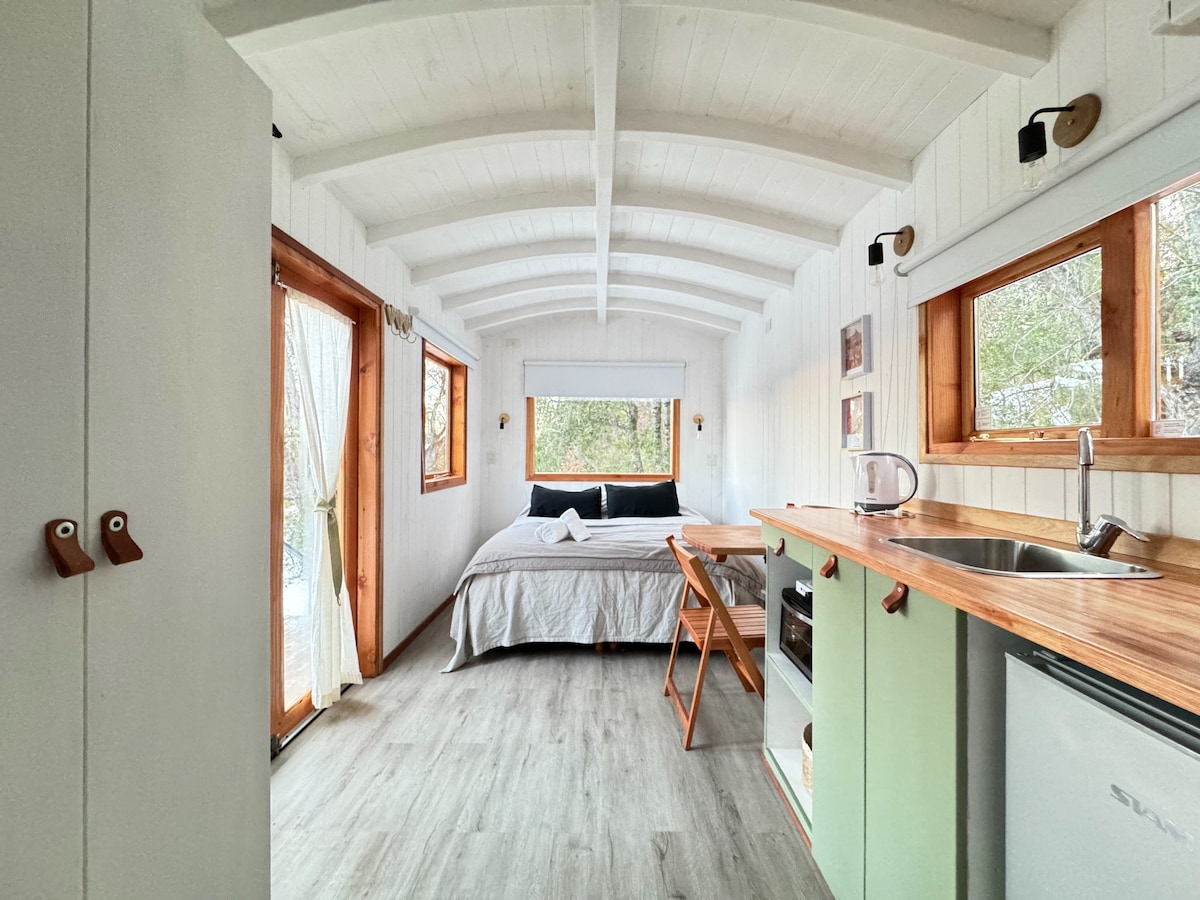Escápate a tu refugio en San Martín de los Andes. Entre árboles nativos esta tiny house combina el diseño de las casitas de pastores inglesas y calidez de montaña. Disfruta del deck privado con vista a la montaña, un café al amanecer y noches bajo cielos estrellados. Salir a caminar y perder la noción del tiempo entre senderos de Coihues y Amancays llenando el pecho de aire puro. A 10 min del centro es perfecta para parejas que buscan privacidad, aventureros y amantes de la naturaleza.