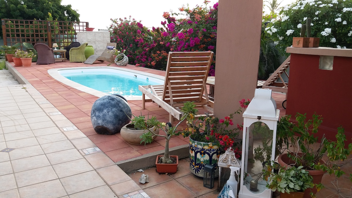 Esta encantadora villa en Sero Colorado está a solo 10 minutos a pie/2 minutos en coche de Baby Beach. La zona es revitalizante y ofrece un refugio tranquilo lejos de las multitudes. - 3 dormitorios y 3 baños en suite. - Capacidad para 8 personas. - Cocina totalmente equipada. - Gran piscina de 5x10 metros. - Aire acondicionado en todas las habitaciones. - Lavadora y secadora. - Amplio patio cerrado con cenador Hay restaurantes y tiendas de comestibles a 15 minutos en coche, por lo que es perfecta para familias y grupos que buscan una escapada memorable.