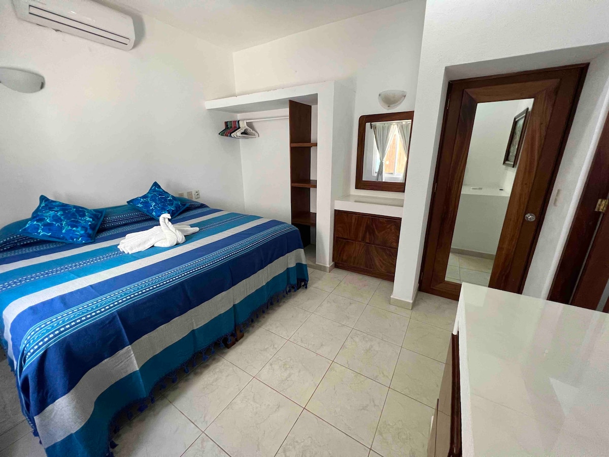 Hubicado a solo 4 min de la playa. Recientemente renovado con pisos, techo y pintura nueva. La habitacion y patio cuenta con su propia entrada privada solo para ti. Al suvir las escaleras tendras la vista de las copas de arboles con sonidos relajantes de diferentes aves de la zona. El lugar es amplio con una terraza privada. Ahy mismo ahy una mesa y sillas para que convivas en familia o te relajes tomandote una tacita de cafe por las mañanas es muy agradable.