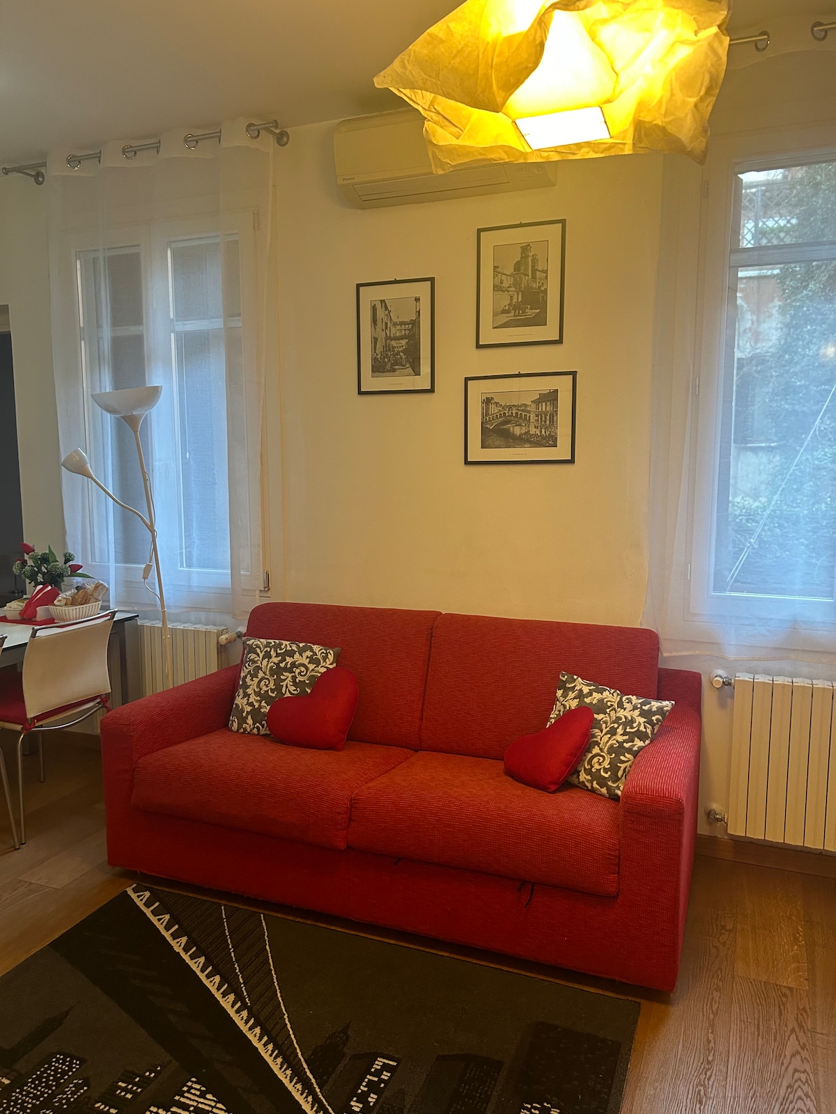In the heart of Venice, 3 minutes from San Marco and 6 minutes from Rialto, Cà Laura has been designed to make you enjoy a true Venetian experience to the fullest, enjoying a splendid view of one of the most characteristic canals of the city'. It consists of a full kitchen, with dishwasher, washing machine, oven, microwave, Nespresso machine and Alessi dishes and glasses and pots. Double bedroom, sofa, 44-inch TV, fiber Wi-Fi, air conditioning in both the bedroom and the living room.
