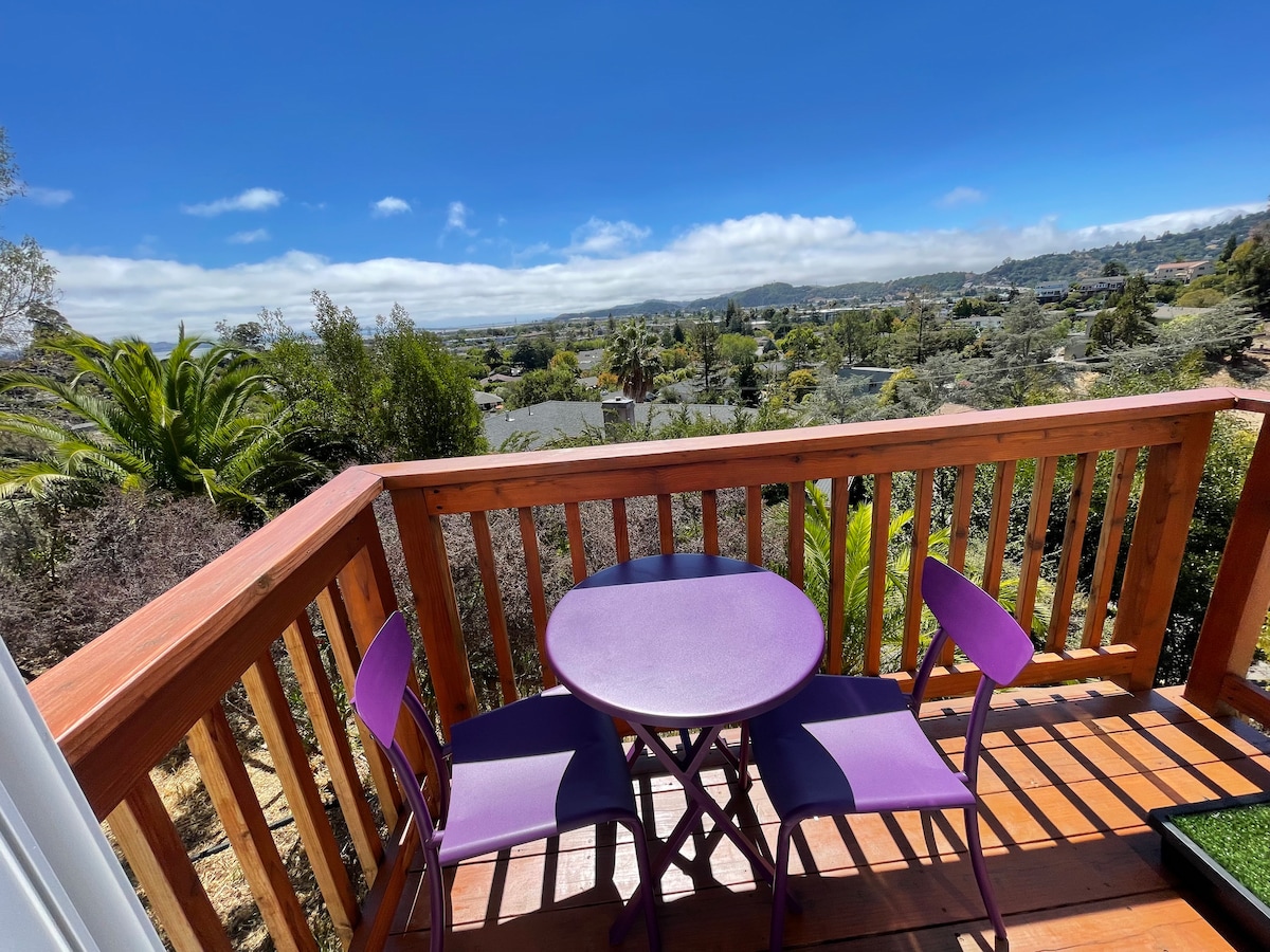 Disfruta de las puestas de sol desde tu terraza privada en las colinas sobre San Rafael, un refugio tranquilo que se siente como una casa del árbol (¡sin escaleras!). ¡Primer alquiler vacacional certificado como Empresa Ecológica en Marin, enero de 2026! A solo 15 minutos de San Francisco y a 45 minutos de Napa o Sonoma, es la base perfecta para explorar las ciudades y senderos de Marin o simplemente relajarse (¡a los huéspedes les encanta la cama!). Edificio separado, piscina climatizada (mayo-septiembre) y TV por streaming. ¡Estoy encantado de ayudarte a planificar tu aventura en el Área de la Bahía!
